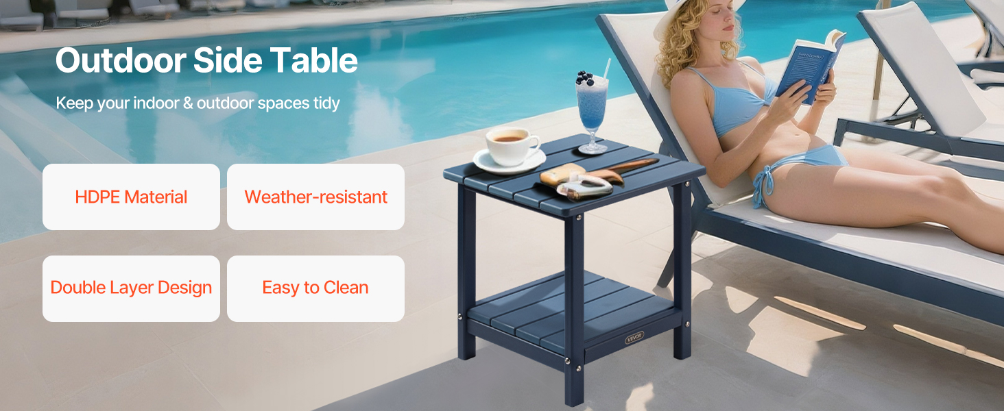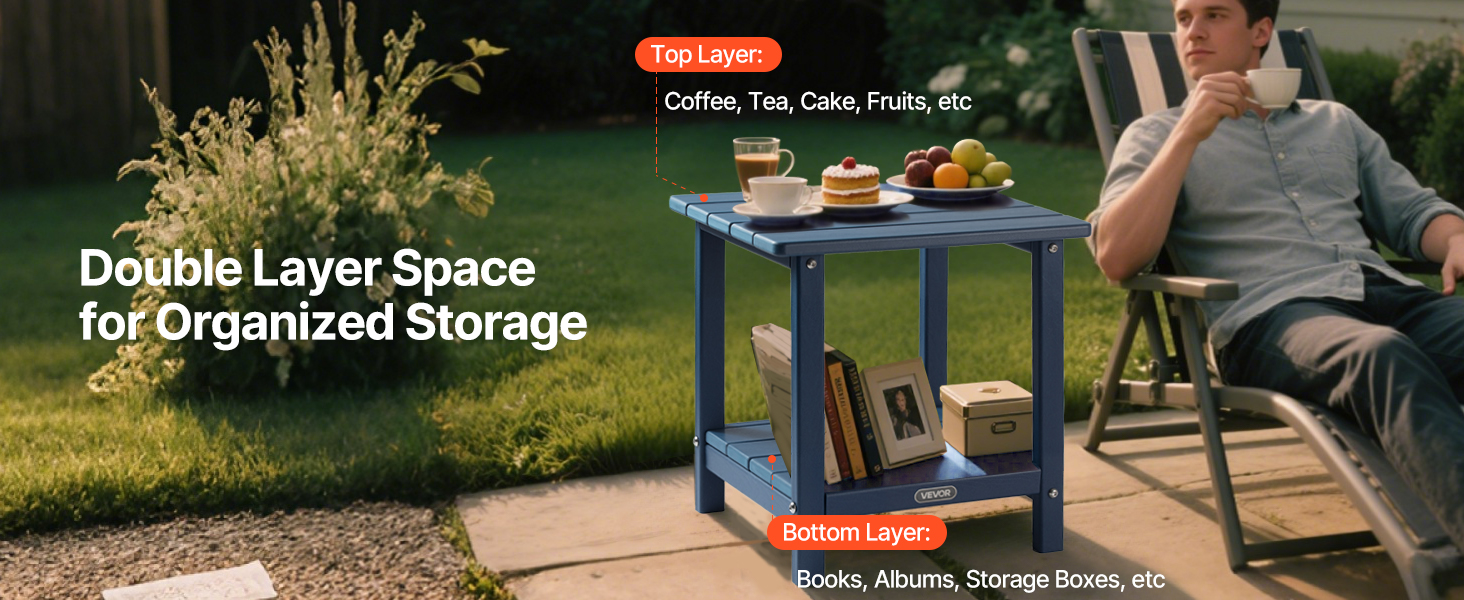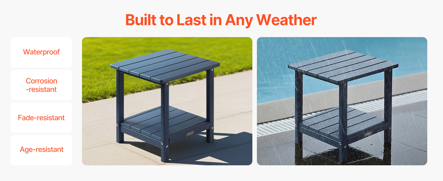 Tento príručný stolík na terasu je vyrobený tak, aby odolal poveternostným vplyvom. Je vodotesný, odolný voči vlhkosti a farebne stály. Dvojvrstvová konštrukcia ponúka dostatok úložného priestoru, vďaka čomu udrží váš priestor čistý a uprataný.