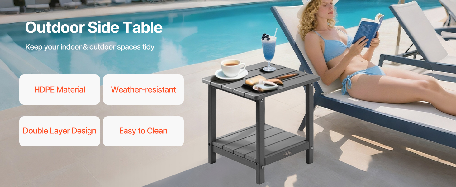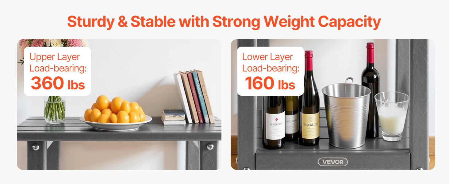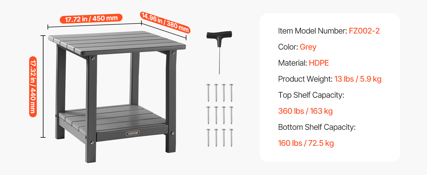 Tento vonkajší príručný stolík, vyrobený z vysokokvalitného materiálu HDPE a pevnej konštrukcie H-rámu, ponúka vynikajúcu pevnosť. Vrchná doska unesie až 360 kg a spodná polica až 160 kg.
