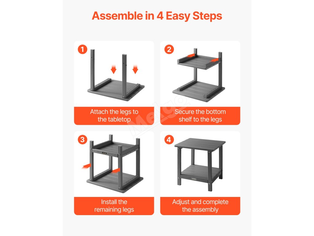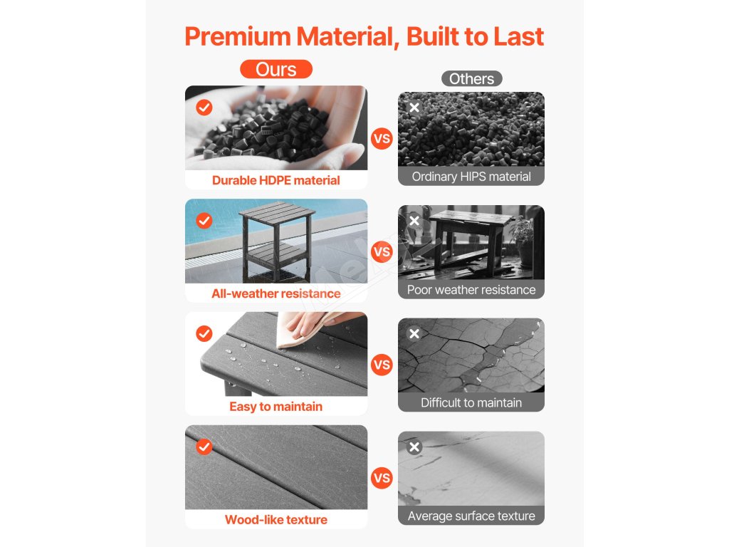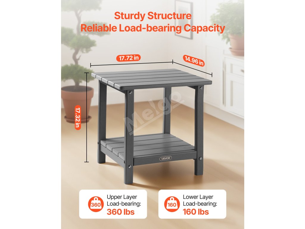 Tento vonkajší príručný stolík, vyrobený z vysokokvalitného materiálu HDPE a pevnej konštrukcie H-rámu, ponúka vynikajúcu pevnosť. Vrchná doska unesie až 360 kg a spodná polica až 160 kg.