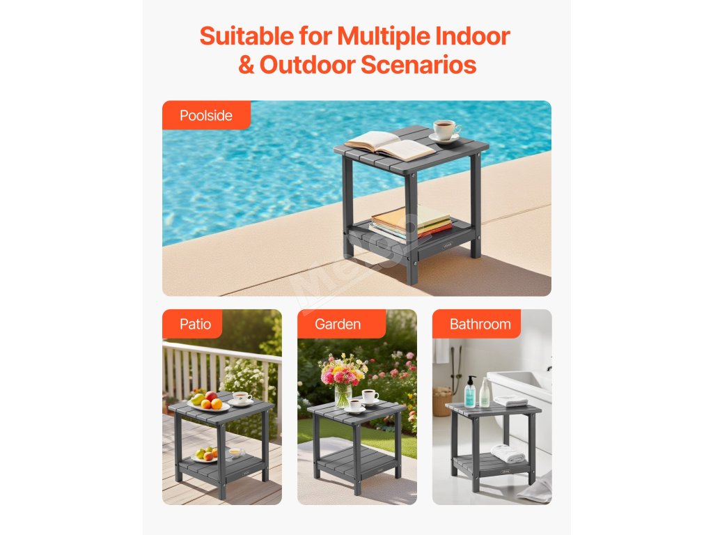 Vonkajší koncový stolík je vhodný k bazénu, na terasu, do záhrady alebo do akéhokoľvek vonkajšieho prostredia. Skvele sa hodí aj na použitie v interiéri, napríklad v kúpeľni, kde zaberá minimum miesta.