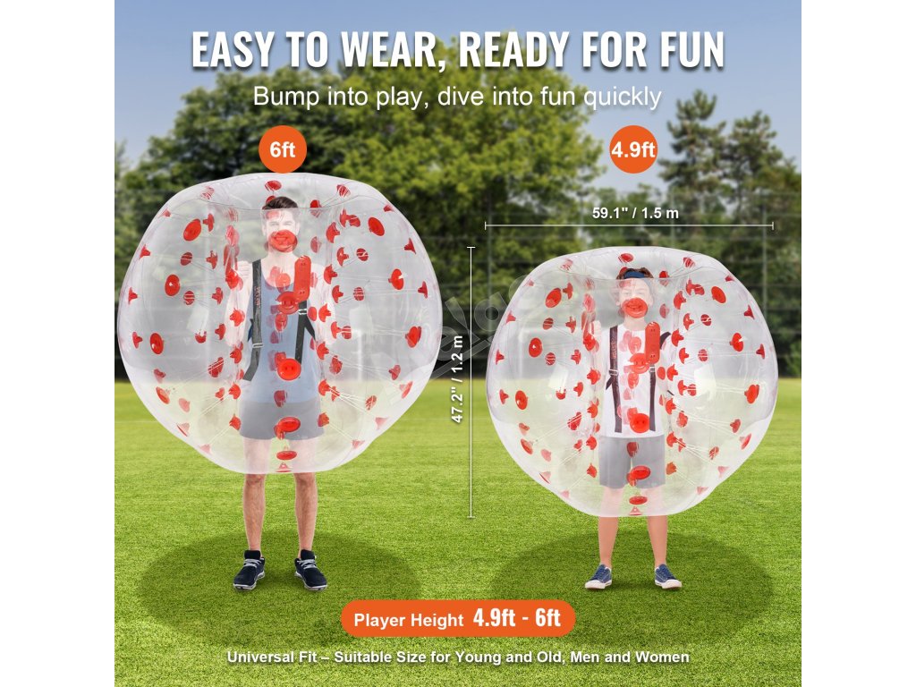 Rozpútajte dokonalú zábavu s nafukovacími loptami VEVOR. Naše nárazníkové lopty s vonkajším priemerom 5 ft, vyrobené z 0,8 mm hrubého PVC odolného proti výbuchu, sú navrhnuté pre maximálnu odolnosť a bezpečnosť. Pripravte sa na nárazové vzrušenie a vytvárajte nezabudnuteľné momenty s bublinkovými futbalovými loptami VEVOR!