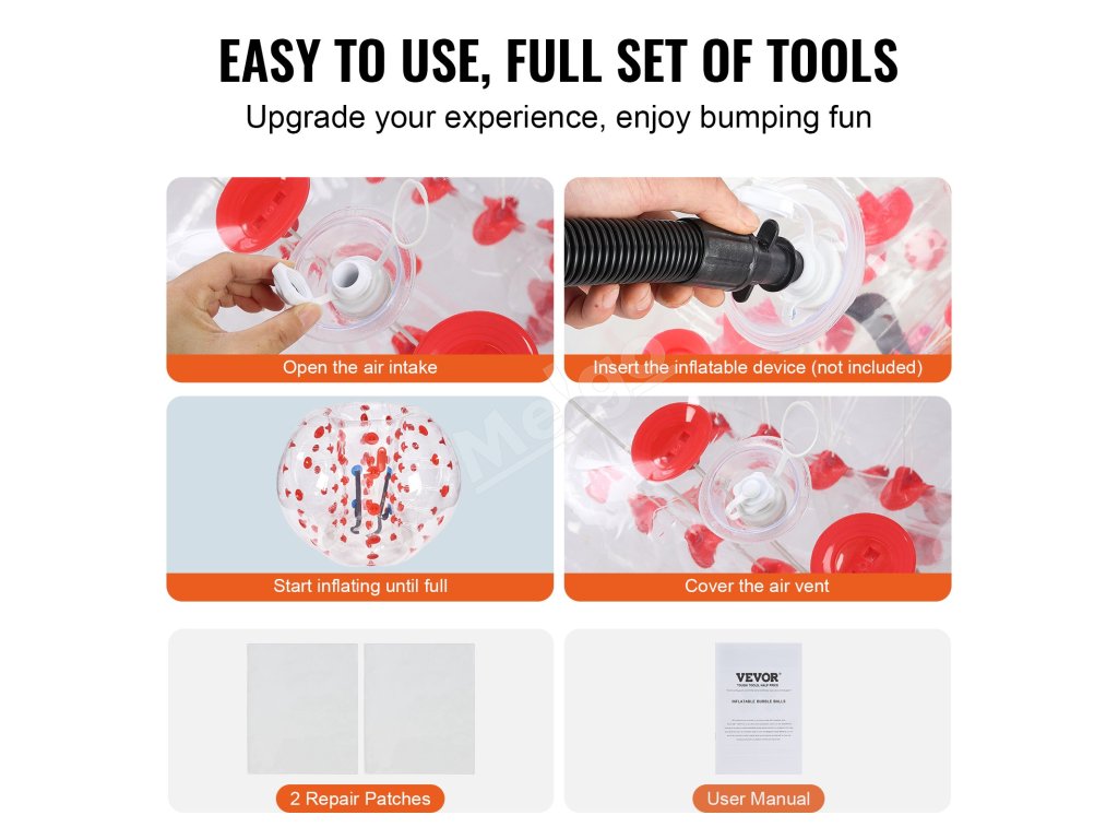 Jednoduché používanie, každá súprava obsahuje podrobný návod na použitie a 2 opravné náplasti. Postup je jednoduchý: jednoducho rozložte výrobok, odskrutkujte veľký nafukovací ventil, nafúknite ho pomocou vzduchovej pumpy (nie je súčasťou balenia) a po úplnom nafúknutí ventil rýchlo utiahnite a začnite hrať.