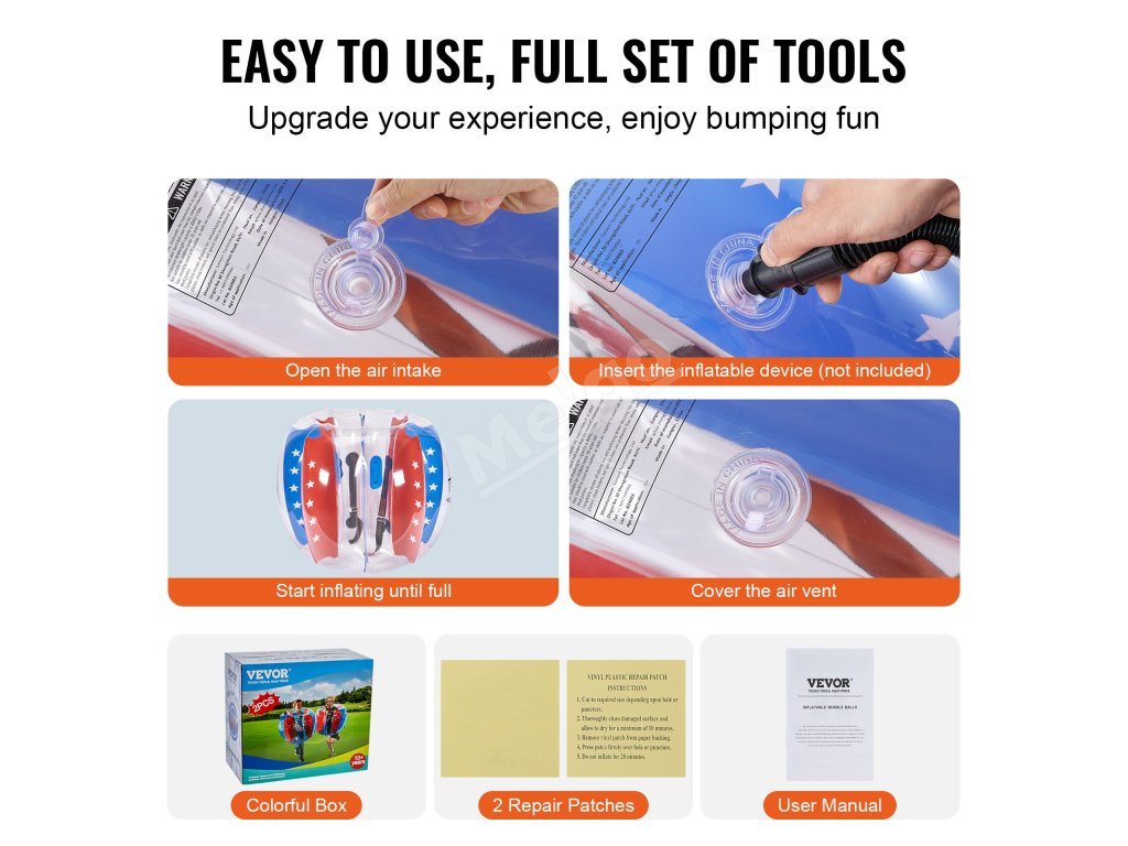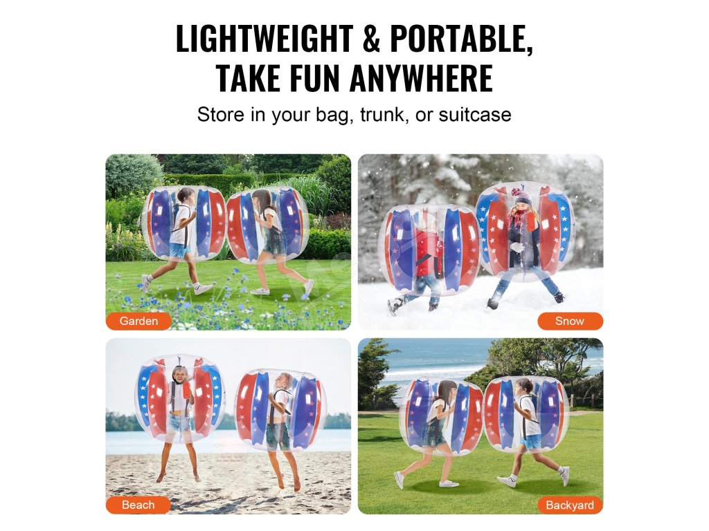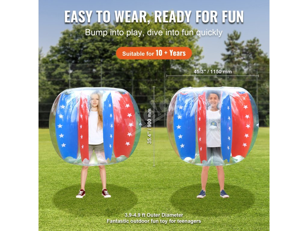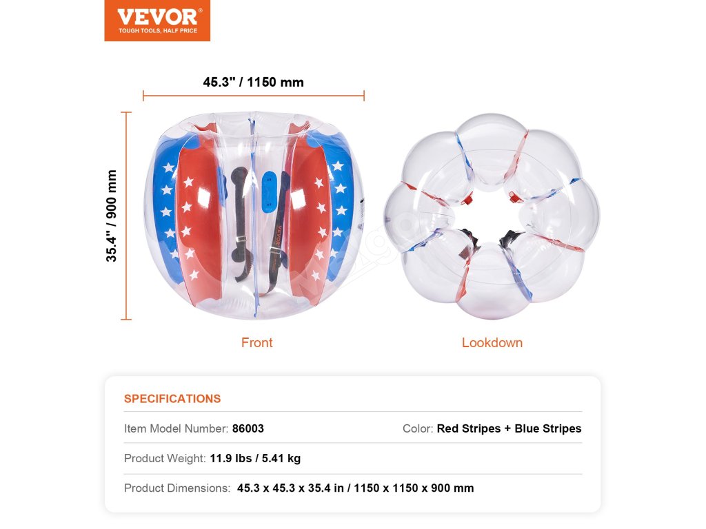 Rozpútajte dokonalú zábavu s nafukovacími loptami VEVOR 2PCS. Naše nárazníkové lopty s vonkajším priemerom 4FT, vyrobené z 0,3 mm hrubého PVC odolného proti výbuchu, sú navrhnuté pre maximálnu odolnosť a bezpečnosť. Pripravte sa na nárazové vzrušenie a vytvárajte nezabudnuteľné momenty s bublinkovými futbalovými loptami VEVOR!