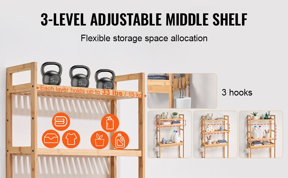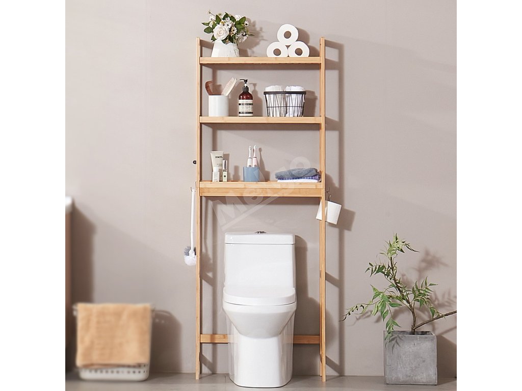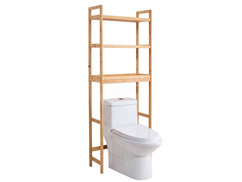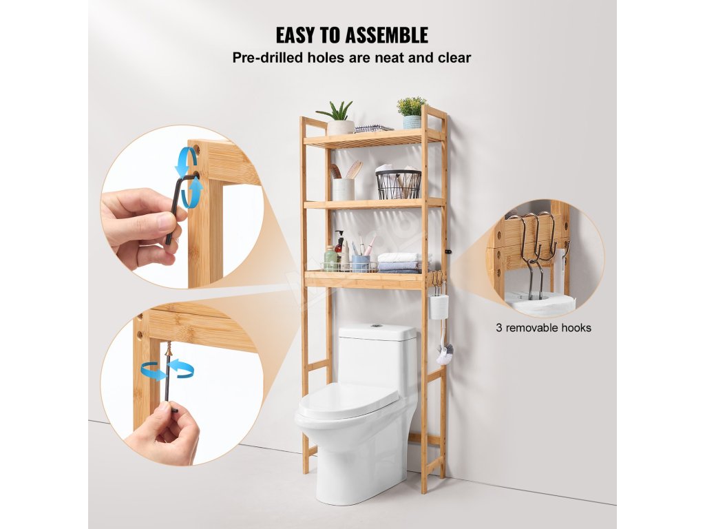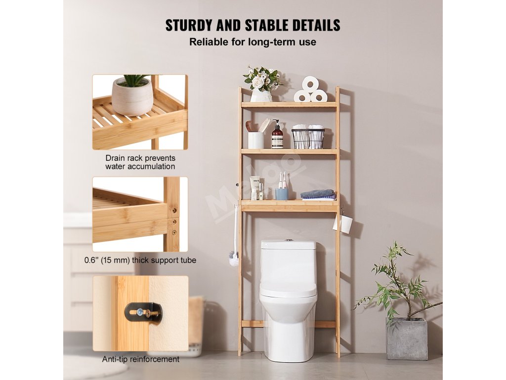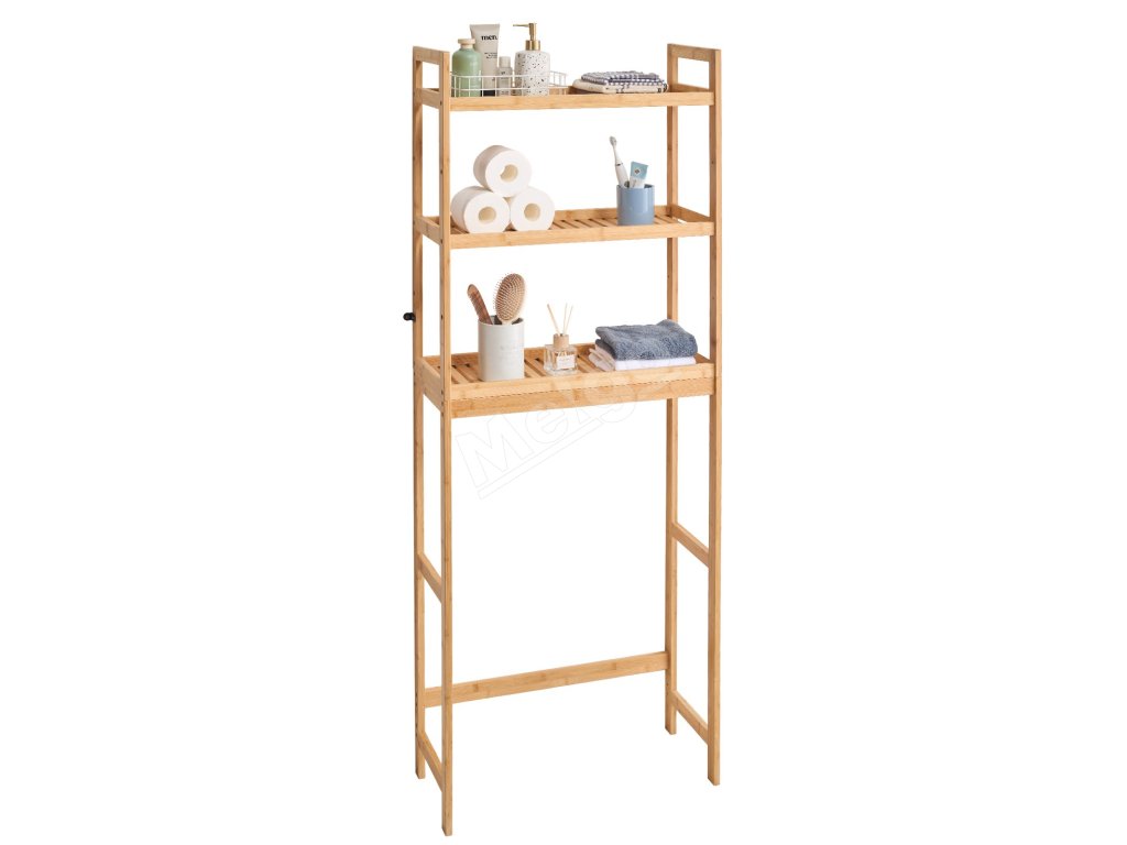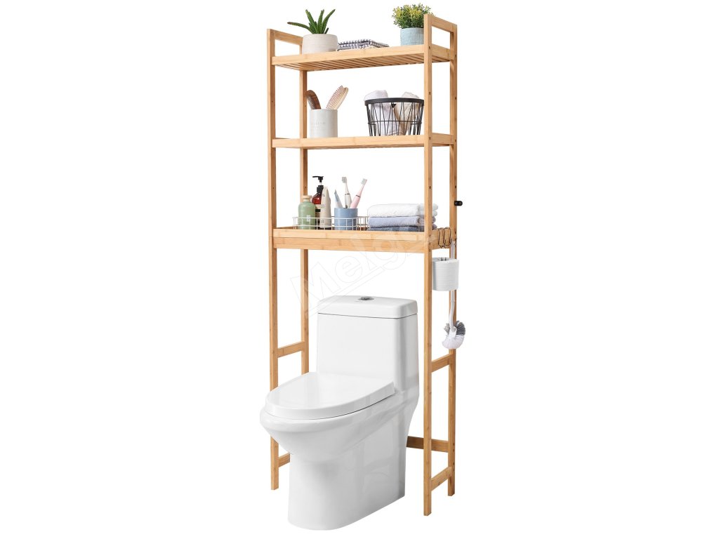 Polica nad wc 3-poschodová nastaviteľná bambusová stojaca s 3 háčikmi