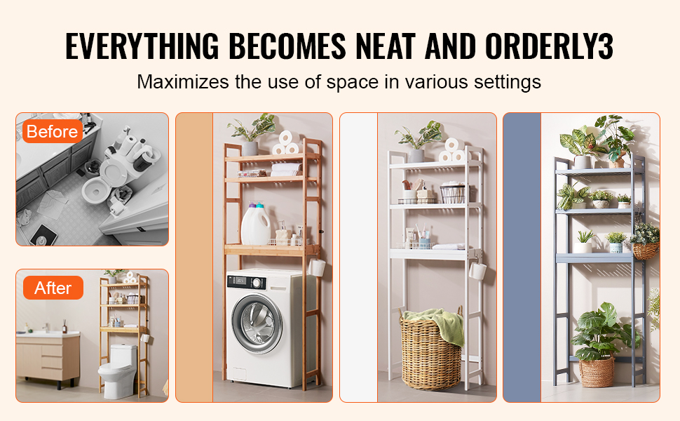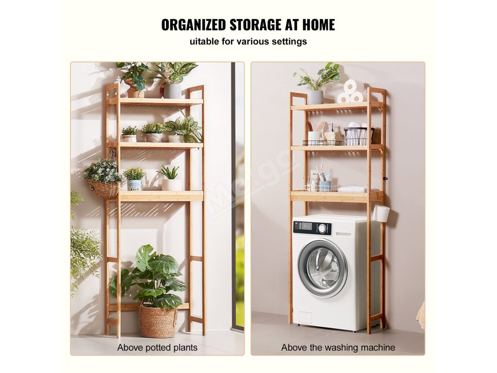 Tento organizérový regál možno použiť nielen nad toaletou, ale s naším úložným regálom možno naplno využiť aj vertikálny priestor nad práčkami, rastlinami v kvetináčoch a úložnými boxmi, ktorý sa hodí do kúpeľní, práčovní a na balkóny.