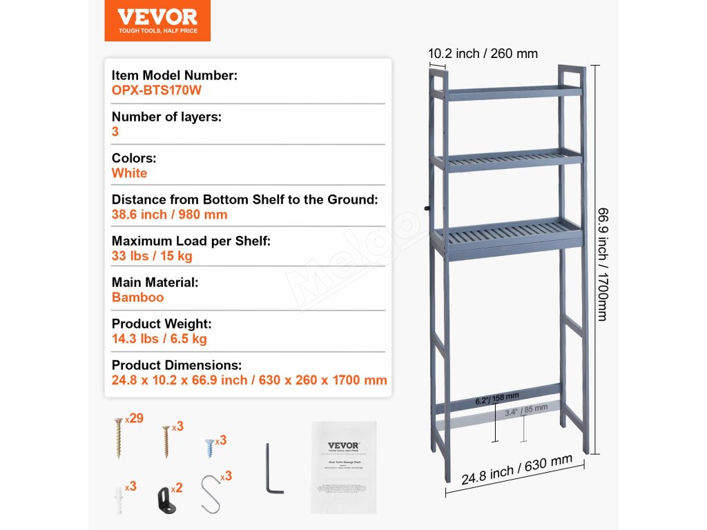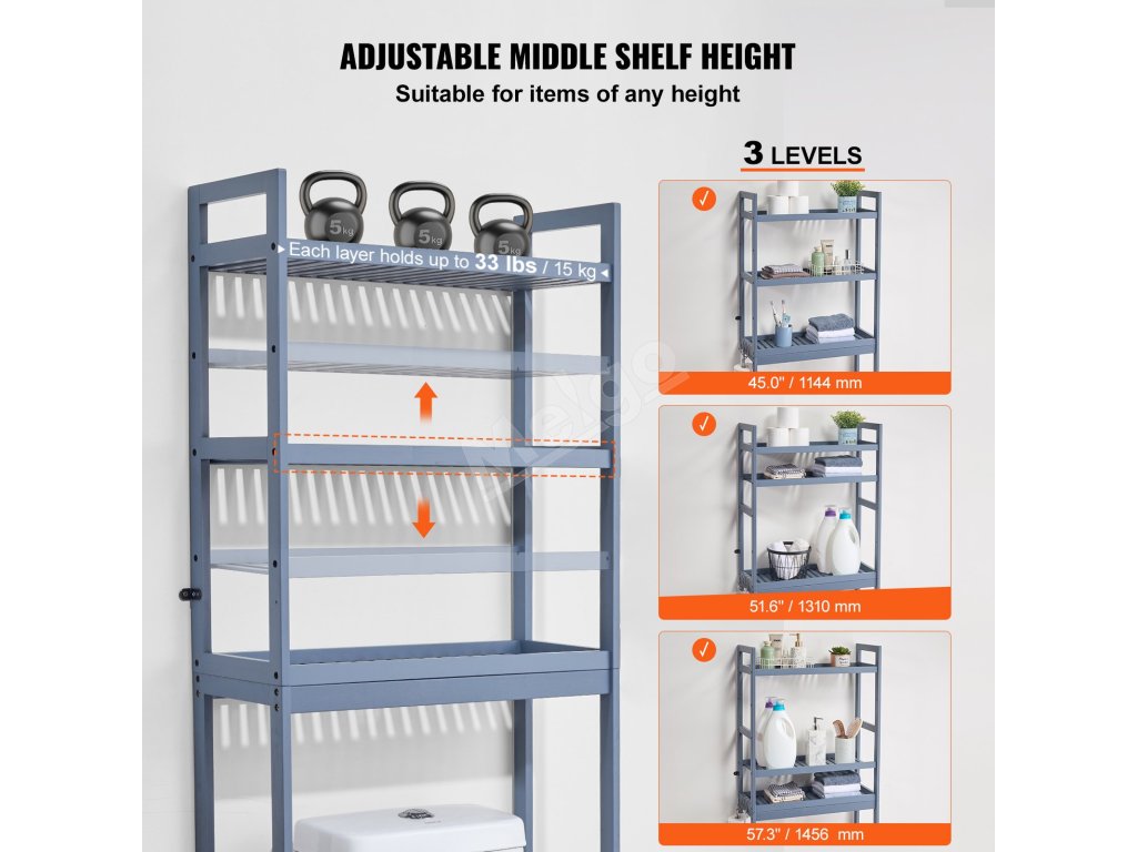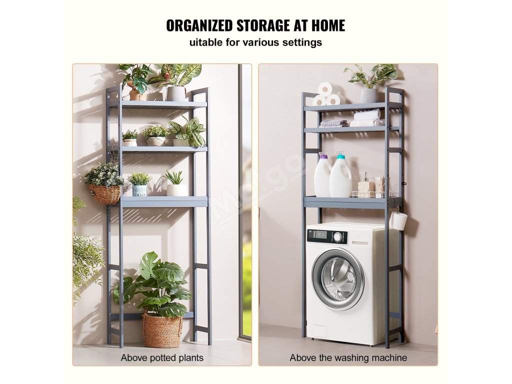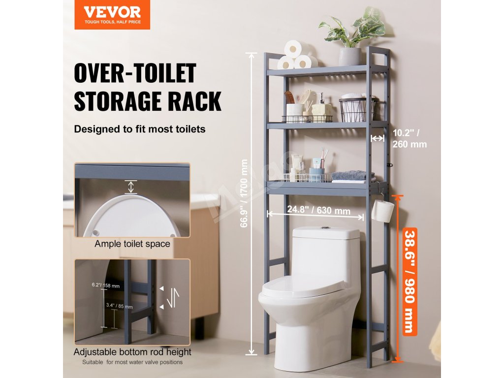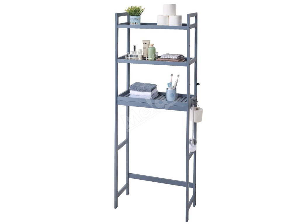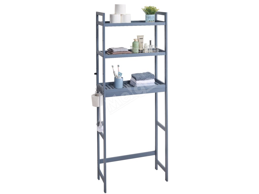 Stojan nad wc, 3-policový nastaviteľný bambusový s 3 háčikmi, sivý