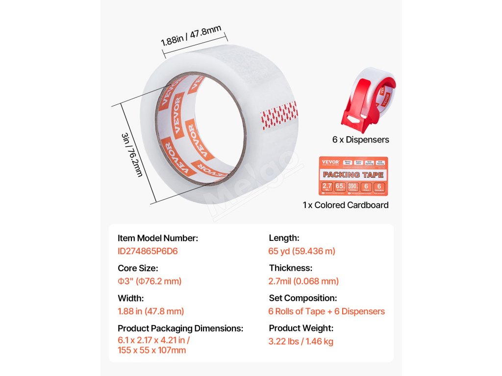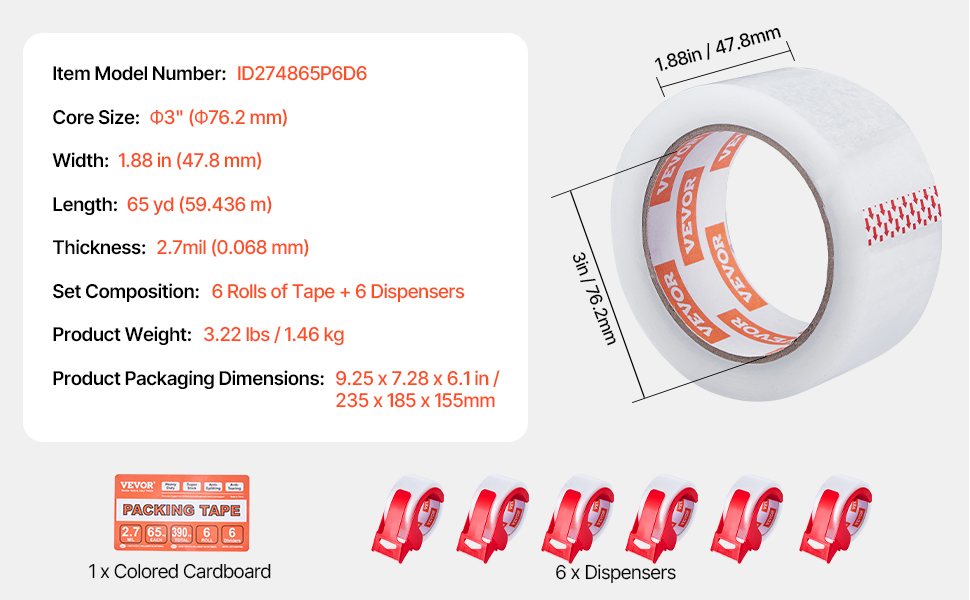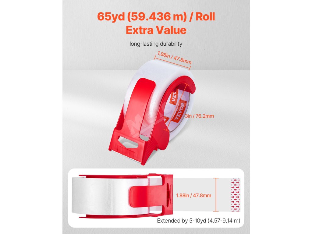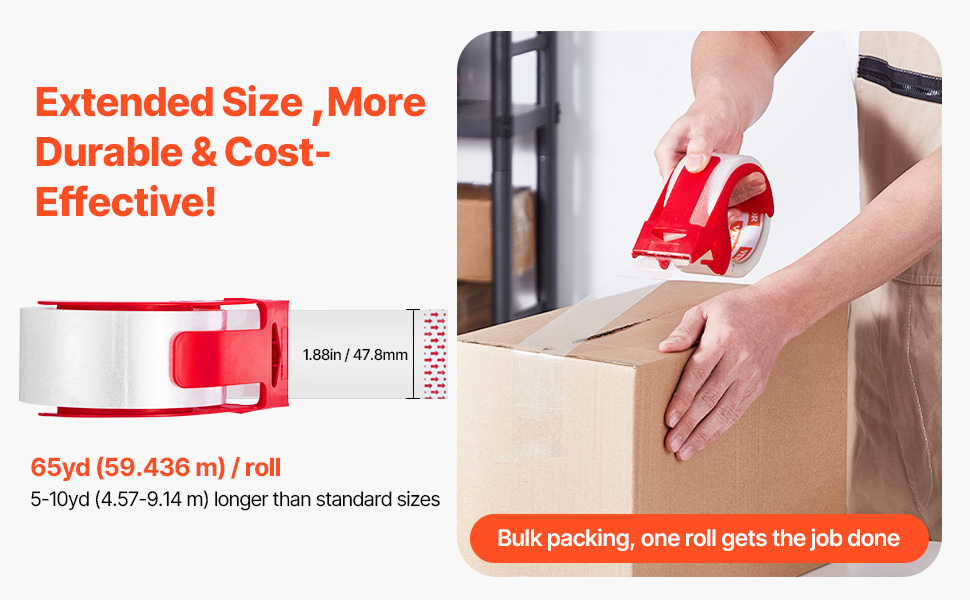 Naša cenovo výhodná súprava priehľadnej baliacej pásky obsahuje 6 kotúčov pásky s 3-palcovým jadrom. Každá rolka má dĺžku 65yd / 59,436 m - 5-10yd / 4,57-9,14 m dlhšiu ako štandardné možnosti. To znamená viac pásky, menej časté výmeny a ekonomickejšie riešenie pre všetky vaše baliace projekty.