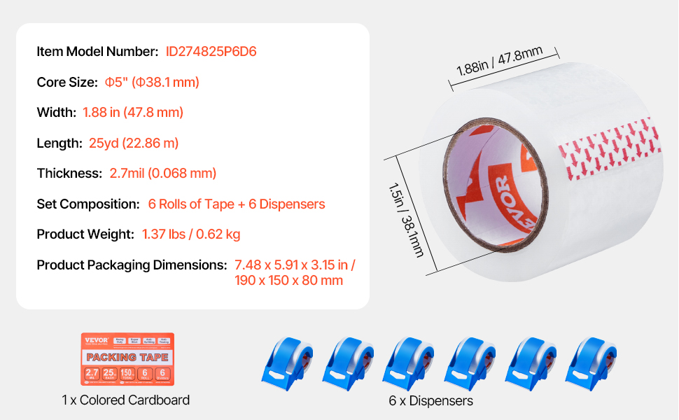 Naša cenovo výhodná súprava priehľadnej baliacej pásky obsahuje 6 kotúčov pásky s 1,5-palcovým jadrom, každý s dĺžkou 25yd / 22,86 m. To je o 2,8yd / 2,57m dlhšie ako typické pásky, čo vám poskytuje dlhšie trvajúce a cenovo dostupnejšie riešenie pre vaše baliace úlohy.