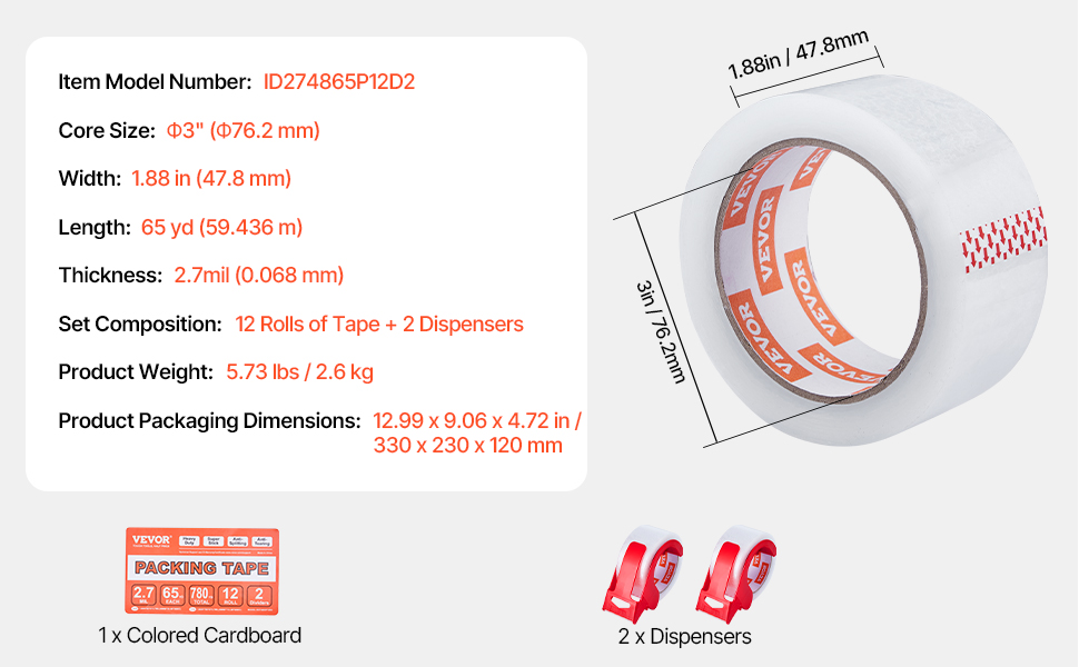 Naša cenovo výhodná súprava priehľadnej baliacej pásky obsahuje 12 kotúčov pásky s 3-palcovým jadrom. Každá rolka má dĺžku 65yd / 59,436 m - 5-10yd / 4,57-9,14 m dlhšiu ako štandardné možnosti. To znamená viac pásky, menej časté výmeny a ekonomickejšie riešenie pre všetky vaše baliace projekty.