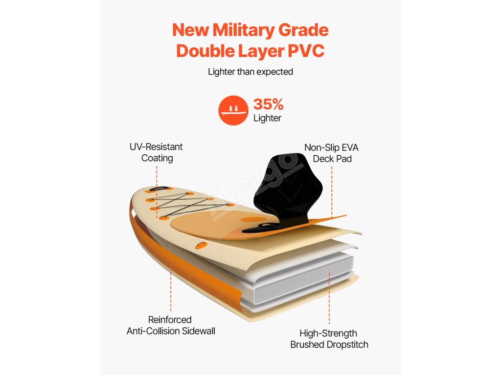 Vnútro stojanovej dosky na pádlovanie vyrobené z nového ultraľahkého dvojvrstvového PVC vojenskej triedy je vybavené vysokokvalitnou kartáčovanou technológiou, ktorá zvyšuje tuhosť dosky a znižuje jej náchylnosť na deformáciu alebo poškodenie. Ergonomická rukoväť uľahčuje prenášanie jednou rukou.