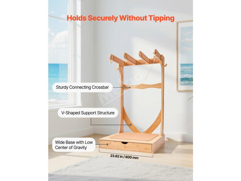 Tento 3-poschodový stojan na surfové dosky je vhodný pre surfové dosky, lyže, kiteboardy a ďalšie športové potreby s rozstupom 160 mm. Vertikálny dizajn sa vyznačuje stabilnou základňou, podložkami odolnými proti poškriabaniu a bezpečnostným lanom. Obsahuje spodnú zásuvku a háčiky na nevyhnutné potreby. Je vyrobený z odolných, udržateľných materiálov, ľahko sa čistí a je ideálny do spální, obývacích izieb alebo surfových obchodov.