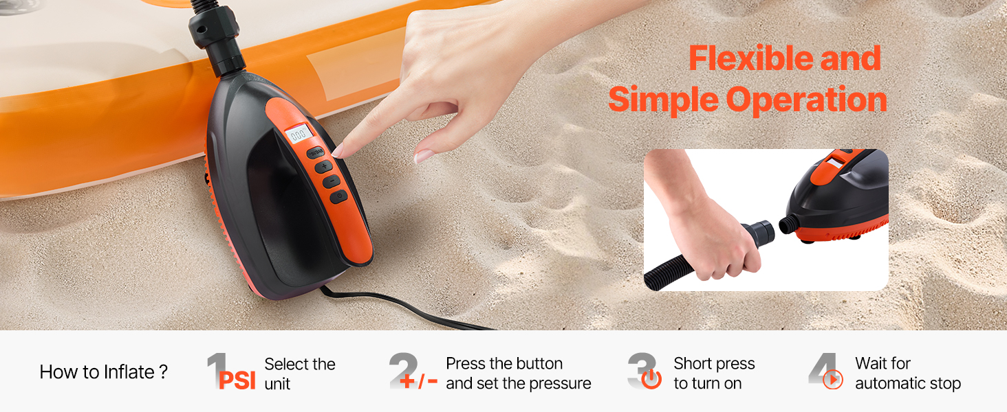 Po pripojení nafukovacej hadice k vypúšťaciemu portu stlačte tlačidlo napájania, čím sa spustí, s možnosťou kedykoľvek pozastaviť. Túto elektrickú pumpu na paddleboardy možno používať nepretržite až 20 minút.