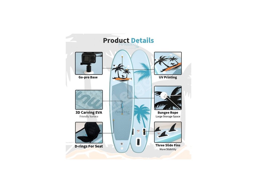 | Obsah balenia: | 1 x Batoh, 3 x Plutva, 1 x Ručná pumpa, 1 x Popruh, 1 x Vodotesná taška, 1 x Vodítko, 1 x Stand Up Paddle Board, 1 x Pádlo, 1 x Sup Seat |