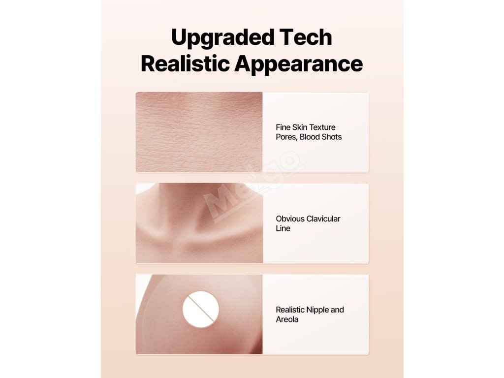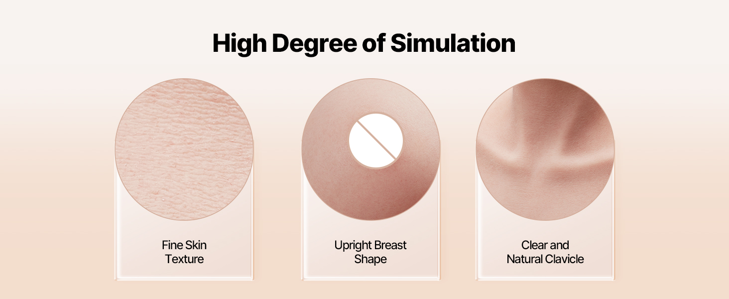 Vysoký stupeň simulácie dizajnu, ktorý dokonale kopíruje prirodzenú krásu. Jemná štruktúra pokožky prináša realistický dotyk a vizuálny efekt; vzpriamený tvar prsníkov zvýrazňuje elegantné krivky; jasné a prirodzené línie kľúčnych kostí umocňujú celkový realistický vzhľad.
