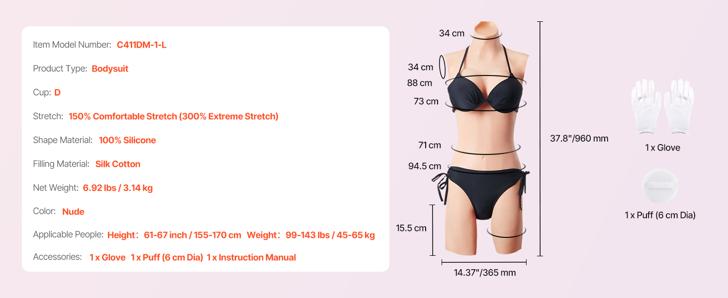 Naše silikónové body v sebe spája pohodlie a realizmus. Vyrobené zo 100 % silikónu a vyplnené hodvábnou bavlnou ponúka mäkký, na dotyk príjemný pocit a vynikajúcu elasticitu, takže je ideálne pre nadšencov cosplay a drag queens. Zvýšte svoje sebavedomie a vzhľad s naším výnimočným body.