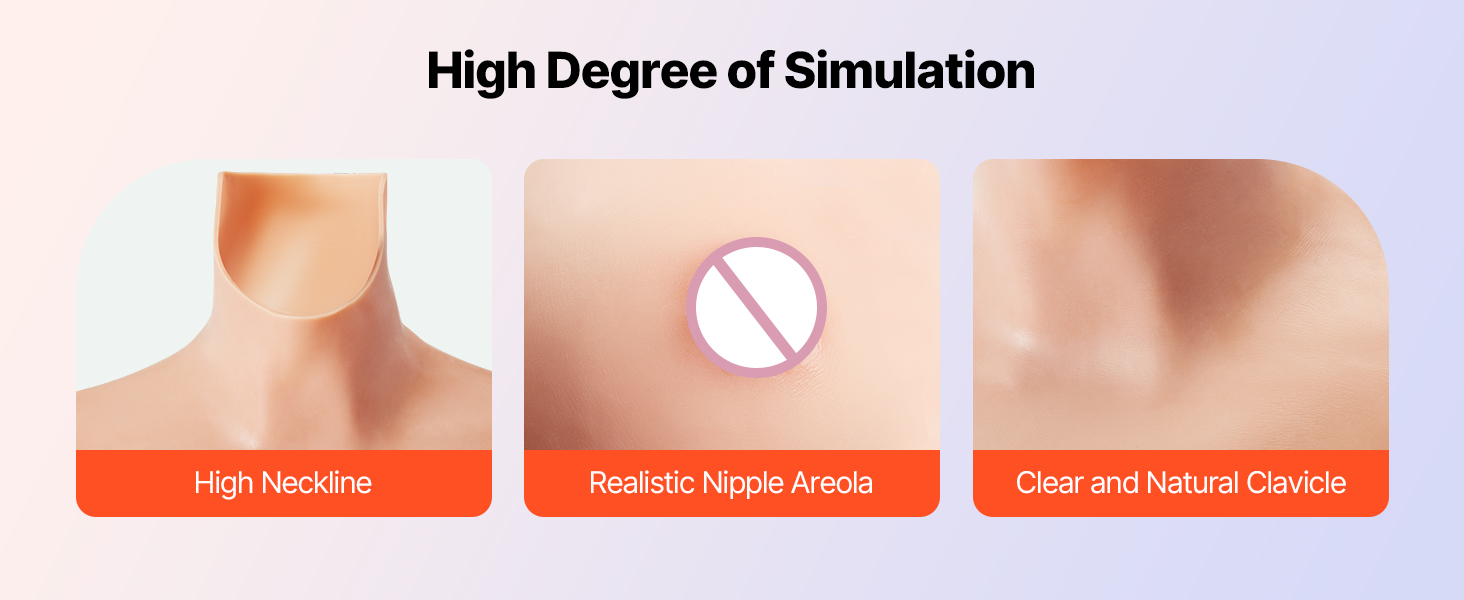 Toto silikónové body s vysokým stupňom simulácie dizajnu ponúka realistický vzhľad s vysokým výstrihom, realistickou areolou bradaviek a jasnými, prirodzenými líniami kľúčnych kostí. Každý detail je starostlivo spracovaný pre autentický, prirodzený vzhľad.