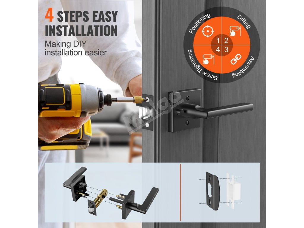 Inštalácia už nemôže byť jednoduchšia. Umiestnite kľučku na dvere a označte pozície otvorov; vyvŕtajte otvory pomocou vŕtačky alebo ručného nástroja; zostavte komponenty kľučky podľa návodu, aby ste sa uistili, že je každá časť bezpečne na svojom mieste; vložte skrutky do otvorov a utiahnite ich skrutkovačom.