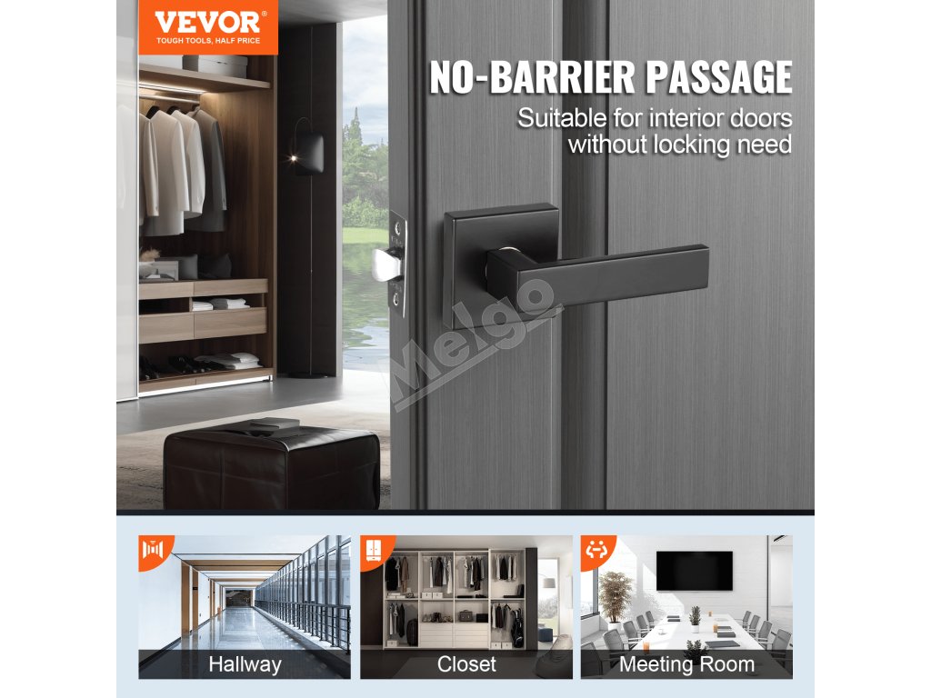 Naša čierna páka na dvere umožňuje plynulý prechod bez potreby zámku. Ideálna na chodby, do šatní, rokovacích miestností a iných priestorov, kde nie sú potrebné kľúče. Dodáva sa s nastaviteľnou západkou 2-3/8" alebo 2-3/4", vhodnou pre 95 % interiérových dverí s hrúbkou od 1-3/8" do 1-3/4".