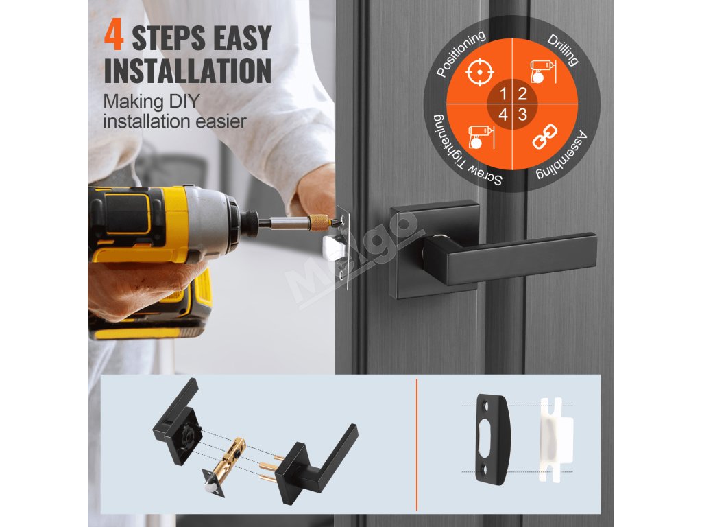Inštalácia nemôže byť jednoduchšia. Umiestnite kľučku na dvere a označte pozície otvorov; vyvŕtajte otvory pomocou vŕtačky alebo ručného nástroja; zostavte komponenty kľučky podľa návodu, aby ste sa uistili, že je každá časť bezpečne na svojom mieste; vložte skrutky do otvorov a utiahnite ich skrutkovačom.