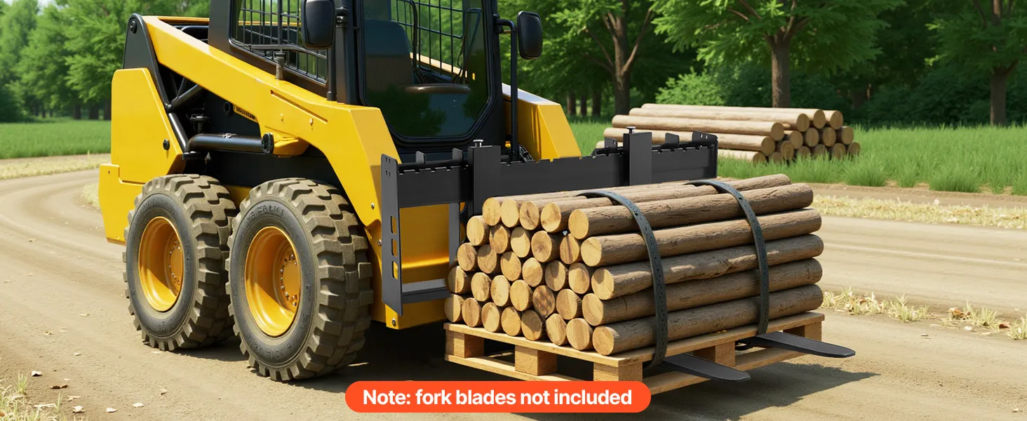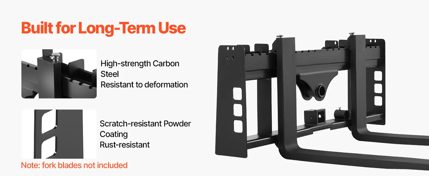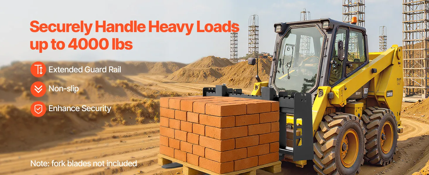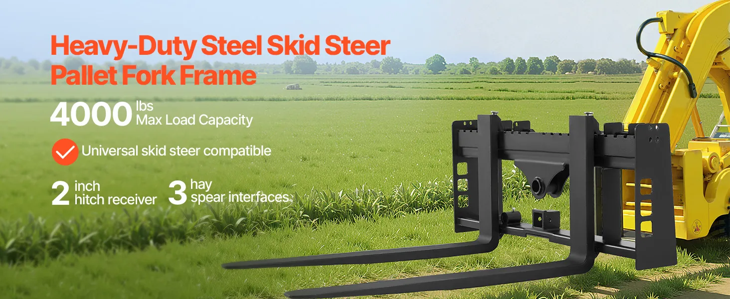 Tento rám paletových vidlíc s nosnosťou 4000 lbs je vhodný pre väčšinu šmykom riadených vozidiel a traktorov. Ideálne na premiestňovanie balíkov sena, stavebných materiálov a ďalších vecí na farmách, záhradách alebo staveniskách. Efektívny a spoľahlivý na náročné úlohy.