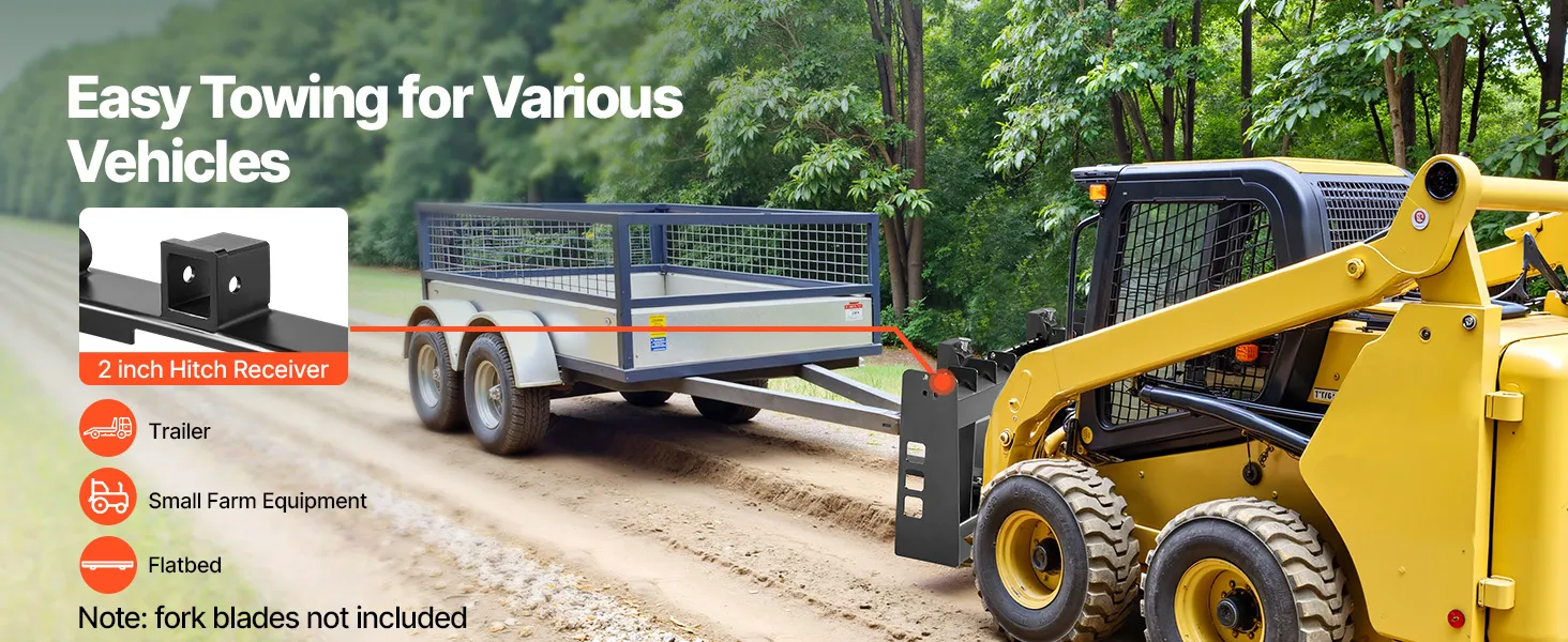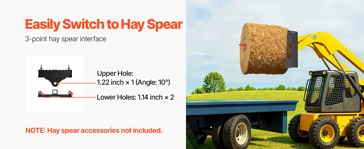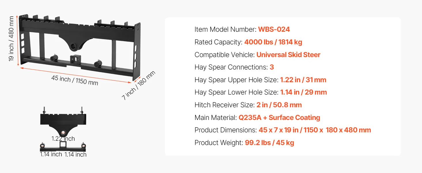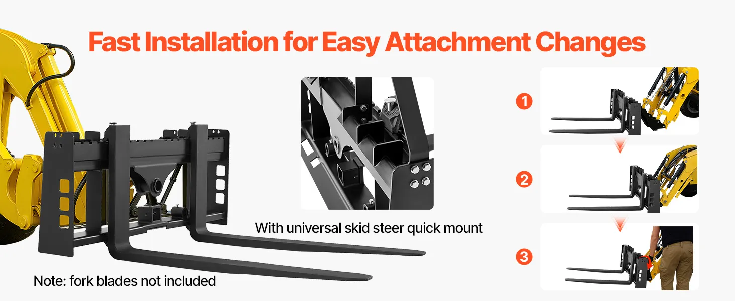 Tento rám paletových vidlíc s nosnosťou 4000 lbs je vhodný pre väčšinu šmykom riadených vozidiel a traktorov. Ideálne na premiestňovanie balíkov sena, stavebných materiálov a ďalších vecí na farmách, záhradách alebo staveniskách. Efektívny a spoľahlivý na náročné úlohy.