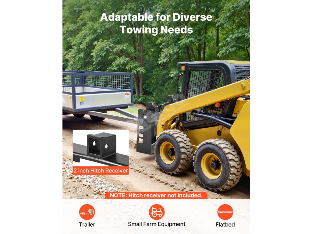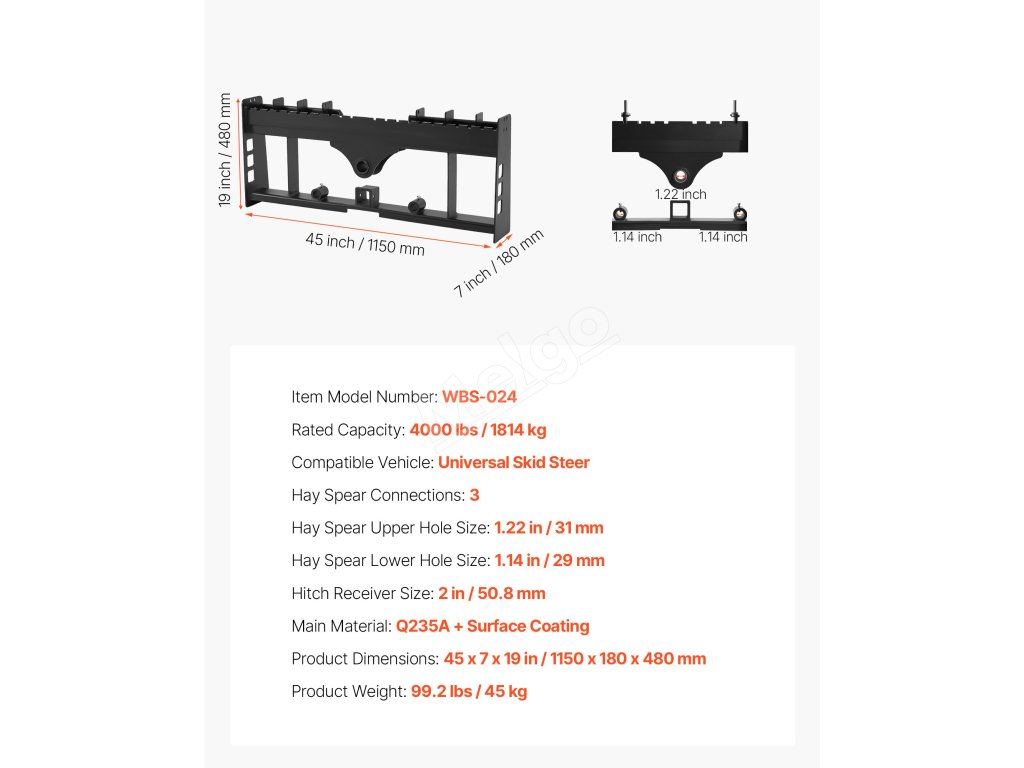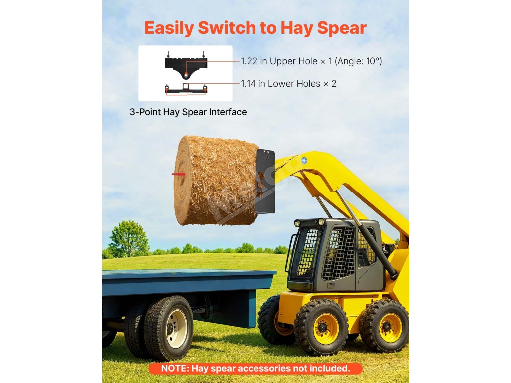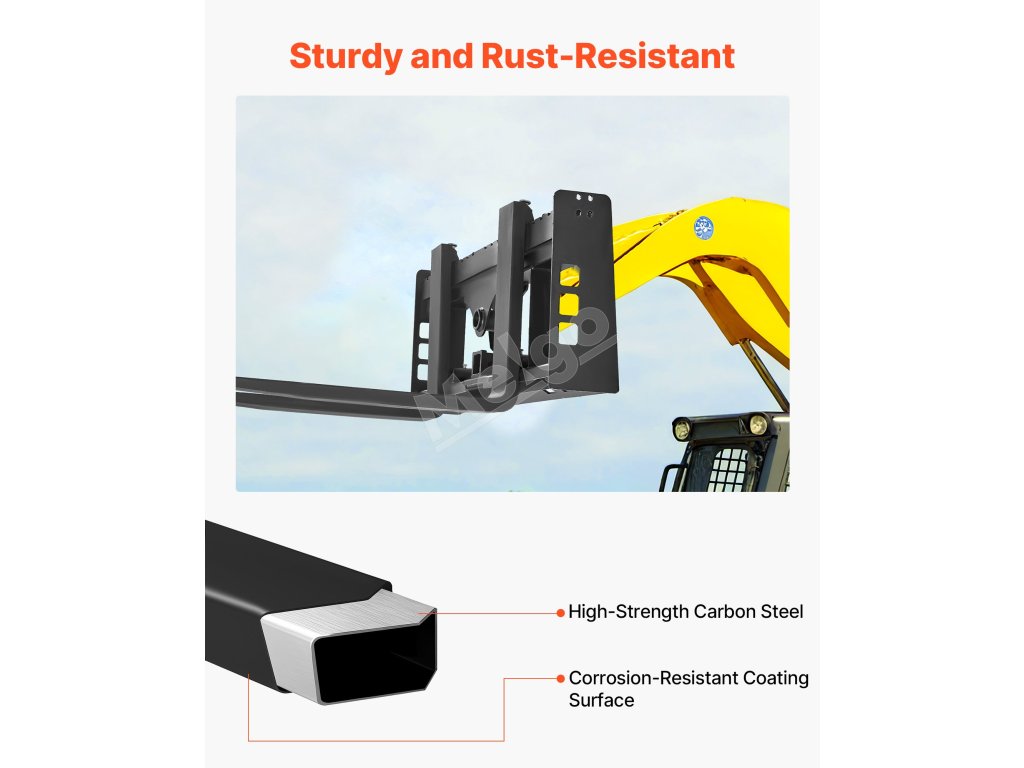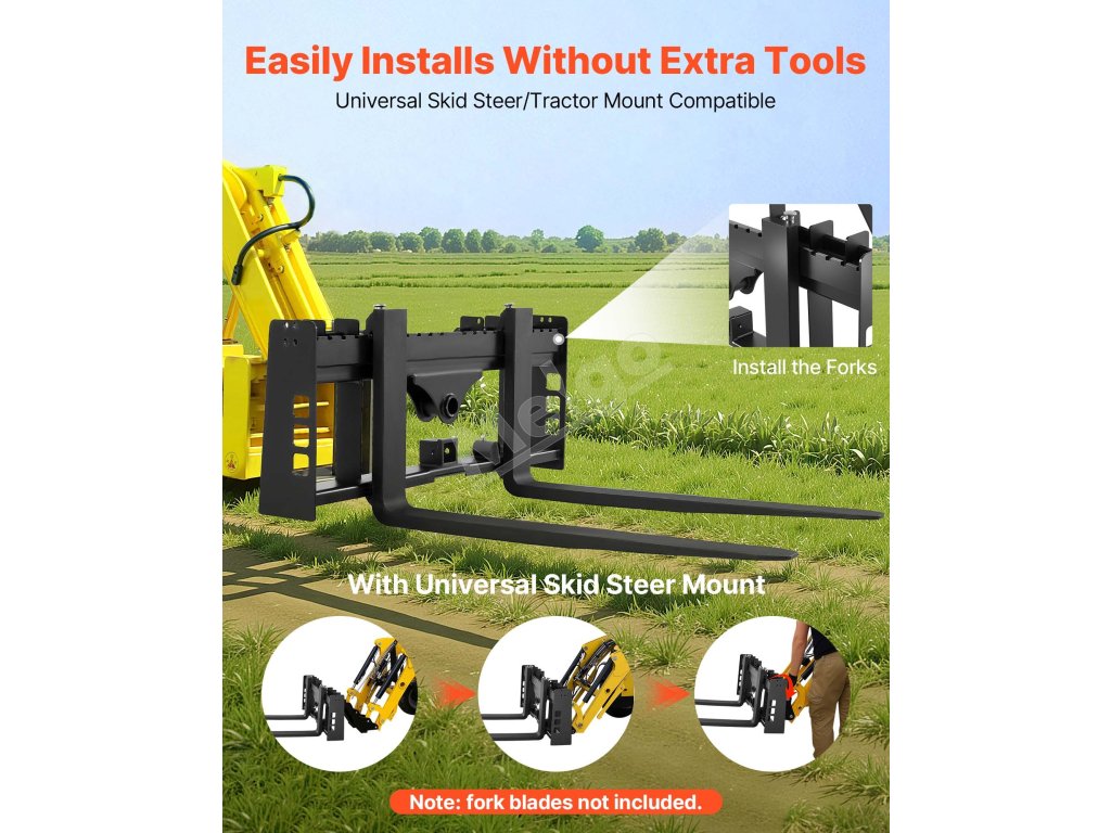 Tento rám paletových vidlíc s nosnosťou 4000 lbs je vhodný pre väčšinu šmykom riadených vozidiel a traktorov. Ideálne na premiestňovanie balíkov sena, stavebných materiálov a ďalších vecí na farmách, záhradách alebo staveniskách. Efektívny a spoľahlivý na náročné úlohy.