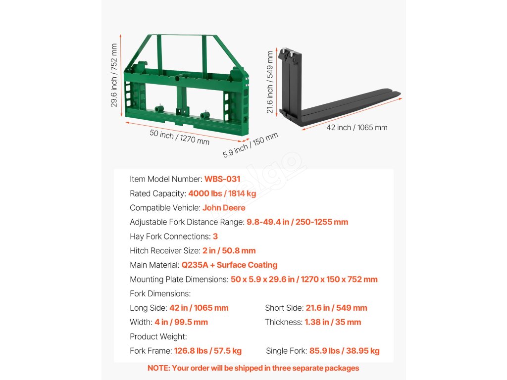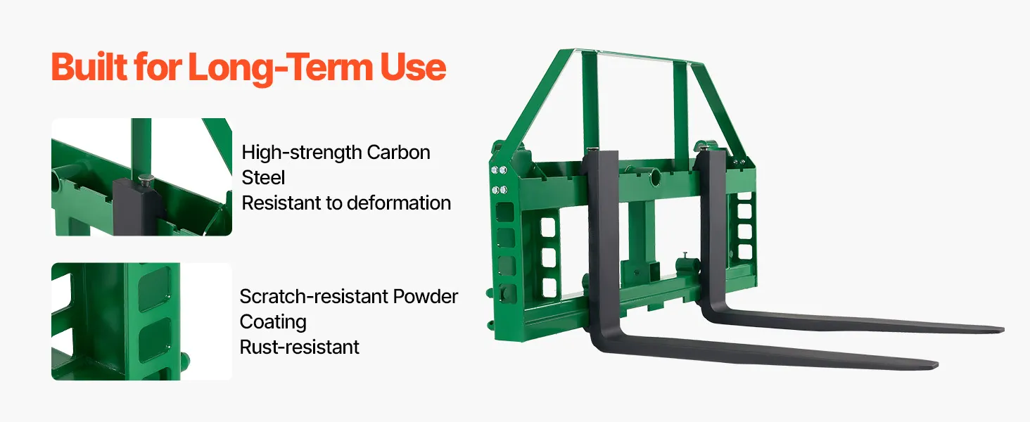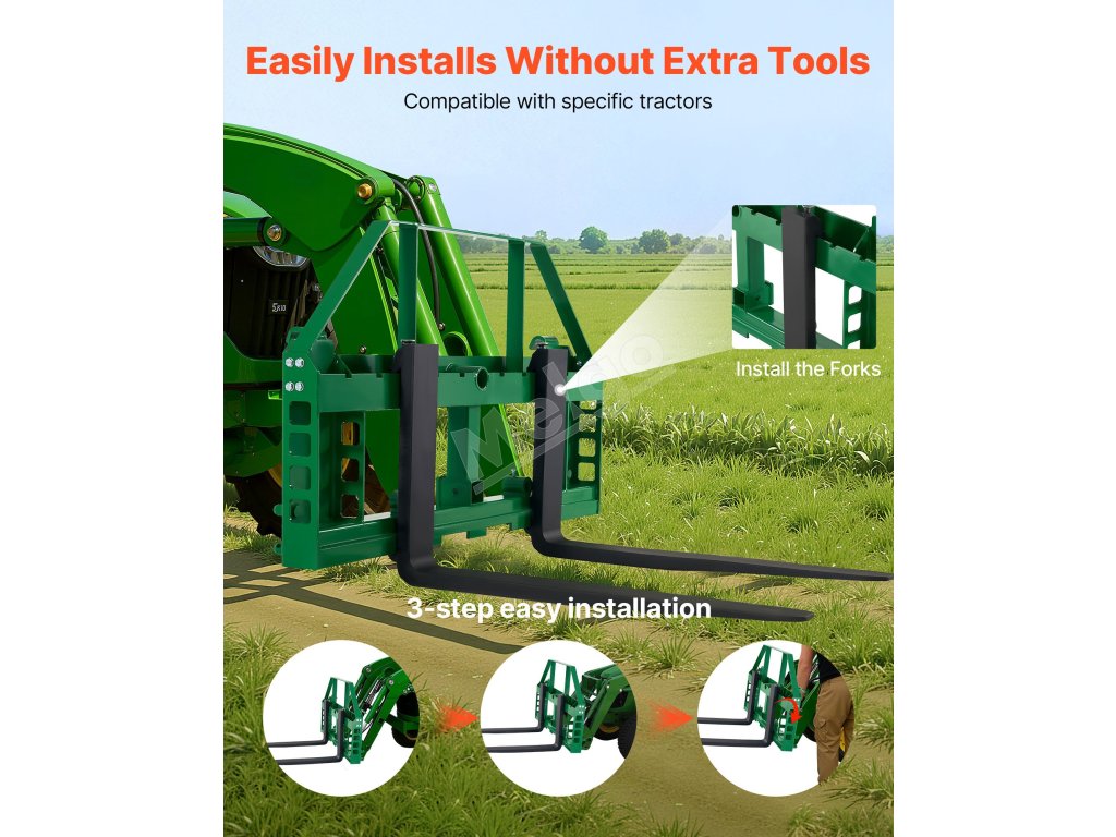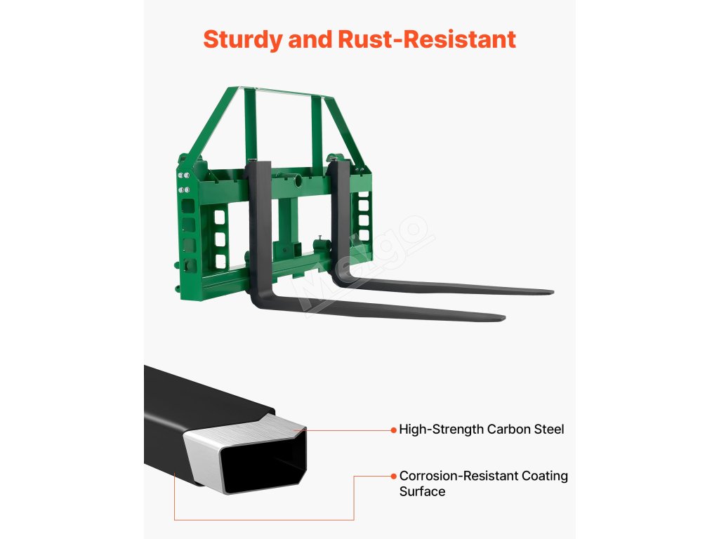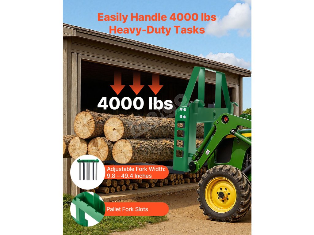 Naše ťažké oceľové vidlice pre šmykom riadené vozidlá majú nosnosť 4000 lbs a sú určené pre traktory John Deere. Ideálne na poľnohospodárske, záhradné a stavebné práce, premiestňovanie balíkov sena, stavebných materiálov a ďalšie.
