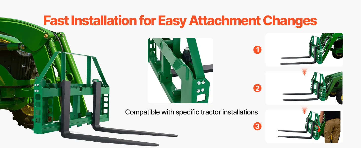 Vďaka držiaku na rýchlu inštaláciu sú naše rýchlo pripojiteľné paletové vidlice určené na použitie s traktormi radu John Deere, čo vám ušetrí čas a námahu.