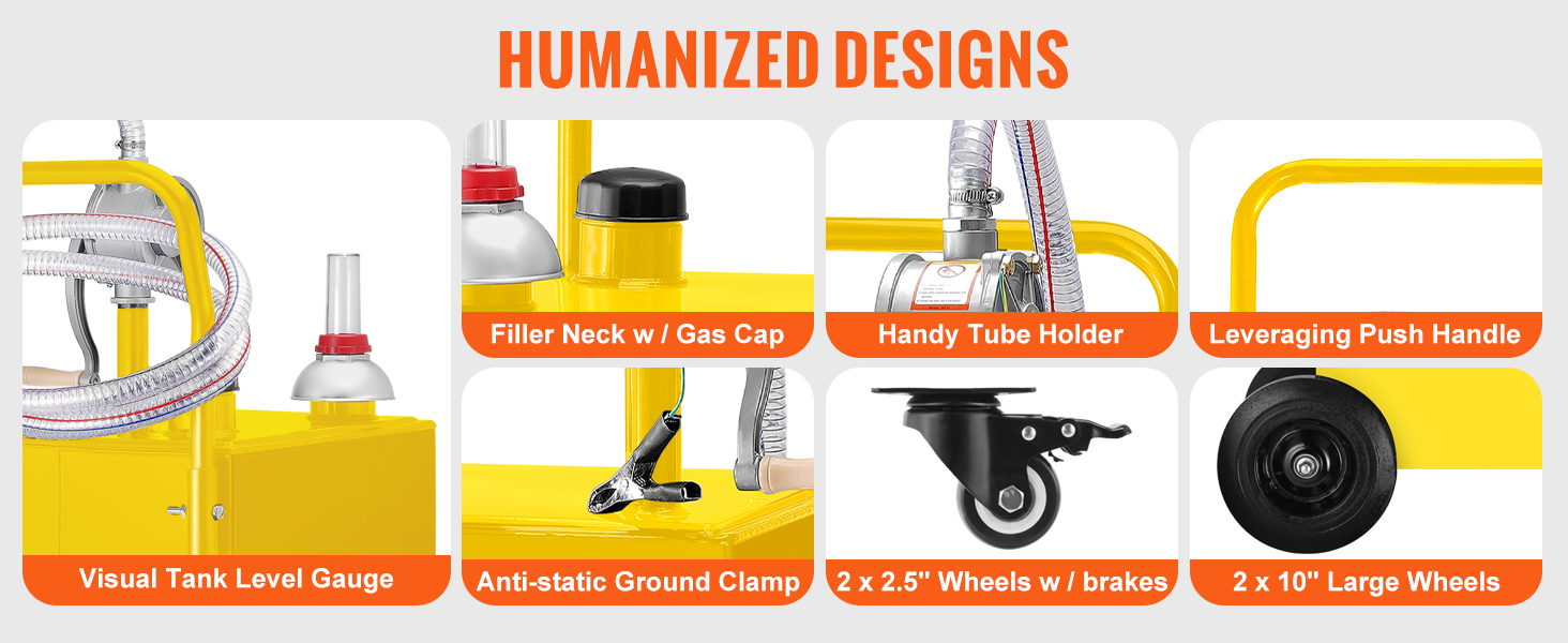 Benzínová kadička má prémiovú konštrukciu. Obsahuje 10" veľké kolieska a 2,5" malé kolieska, antistatickú zemnú svorku, plniace hrdlo s uzáverom na plyn, praktický držiak na hadičku a rukoväť na tlačenie s jednoduchou pákou. všetky tieto konštrukcie podporia efektívnu a bezpečnú prácu.