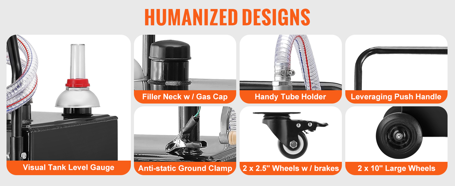 Benzínová kadička má prémiovú konštrukciu. Obsahuje 10" veľké kolieska a 2,5" malé kolieska, antistatickú zemnú svorku, plniace hrdlo s uzáverom na plyn, praktický držiak na hadičku a rukoväť na tlačenie s jednoduchou pákou. všetky tieto konštrukcie podporia efektívnu a bezpečnú prácu.