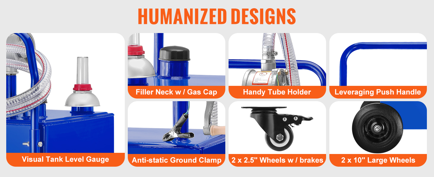 Benzínová kadička má prémiovú konštrukciu. Obsahuje 10" veľké kolieska a 2,5" malé kolieska, antistatickú zemnú svorku, plniace hrdlo s uzáverom na plyn, praktický držiak na hadičku a rukoväť na tlačenie s jednoduchou pákou. všetky tieto konštrukcie podporia efektívnu a bezpečnú prácu.