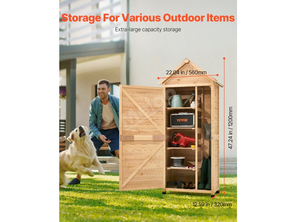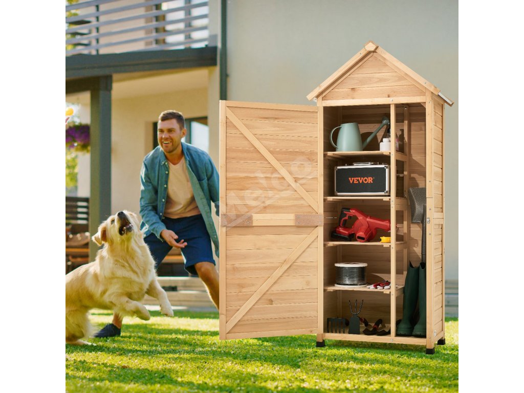 Veľký drevený vonkajší skladovací prístrešok, navrhnutý s flexibilným úložným priestorom, pojme rôzne náradie, čo vám umožní jednoduchú organizáciu a rýchly prístup k nemu.