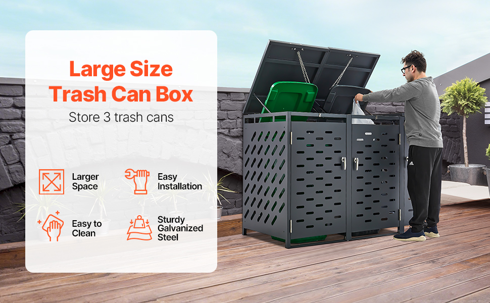 Tento úložný box na odpadkové koše, vyrobený z odolnej pozinkovanej ocele s práškovou povrchovou úpravou, je vhodný pre väčšinu odpadkových košov. Je vybavený výklopným vekom s podpornou tyčou, kovovými zámkami a vnútornou reťazou na zabezpečenie plechoviek, vďaka čomu bude váš dvor uprataný a chránený pred zvieratami.