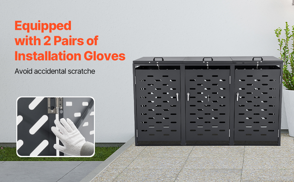 Náš kovový prístrešok na odpadkové koše obsahuje v balení pár montážnych rukavíc, ktoré zabezpečia, že vaše ruky budú počas inštalácie dobre chránené. K dispozícii sú dva páry, ktoré vám a partnerovi uľahčia montáž.