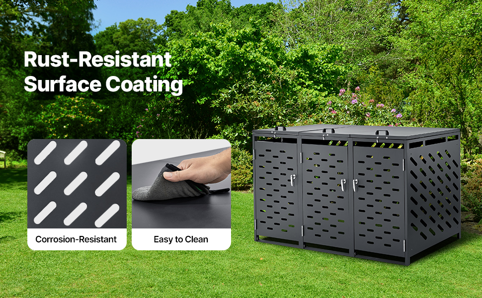 Pozinkovaná oceľ tohto prístrešku na odpadkové koše je ošetrená práškovou farbou, aby sa zabránilo korózii, čo zvyšuje jej odolnosť voči korózii. Táto povrchová úprava tiež uľahčuje čistenie a údržbu, čím sa predlžuje životnosť výrobku.