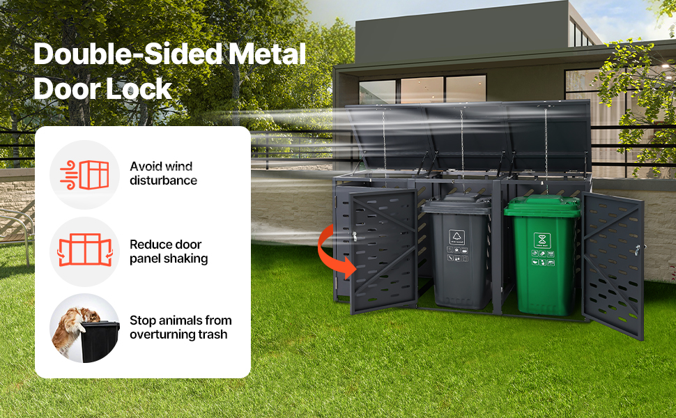Horná a predná časť prístrešku na odpadky sú vybavené kovovými zámkami, ktoré zabezpečujú, že dvere zostanú bezpečne zatvorené aj vo veternom počasí, čím sa zabráni ich otváraniu alebo hluku. Táto konštrukcia predlžuje životnosť dverí a zabraňuje prístupu zvierat k odpadkovému košu.