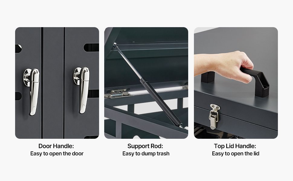 Tento sklad na odpadky obsahuje niekoľko praktických konštrukčných prvkov, ako je rukoväť predných dverí, rukoväť horného veka a podporná tyč veka, ktoré zlepšujú jednoduchosť a pohodlie pri používaní.
