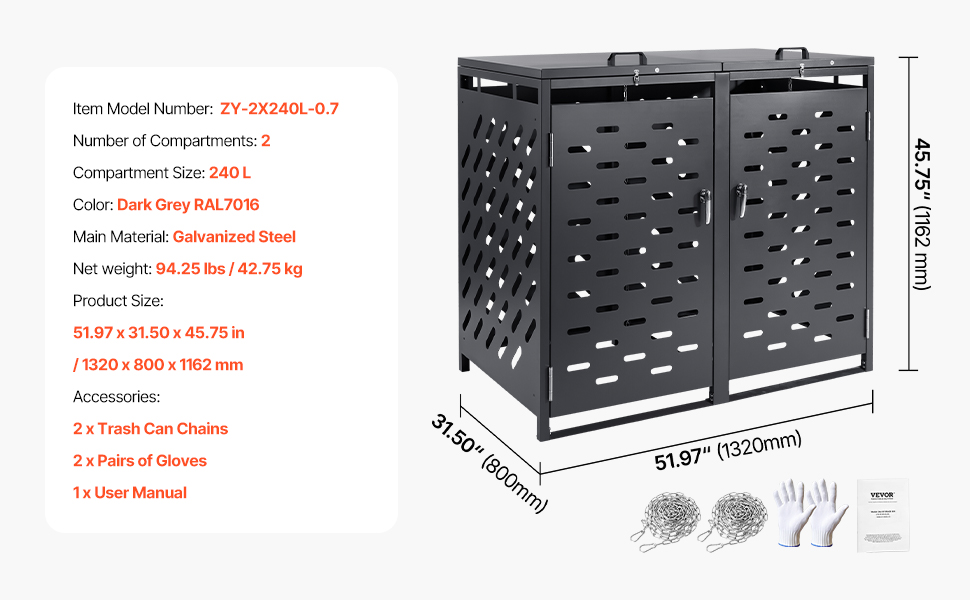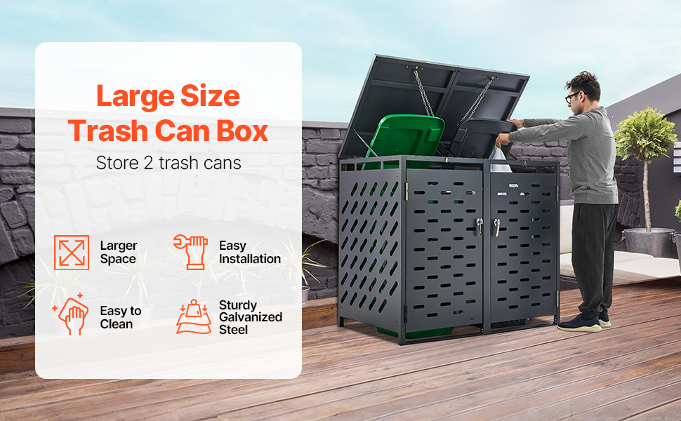 Tento úložný box na odpadkové koše, vyrobený z odolnej pozinkovanej ocele s práškovou povrchovou úpravou, je vhodný pre väčšinu odpadkových košov. Je vybavený výklopným vekom s podpornou tyčou, kovovými zámkami a vnútornou reťazou na zabezpečenie plechoviek, vďaka čomu bude váš dvor uprataný a chránený pred zvieratami.