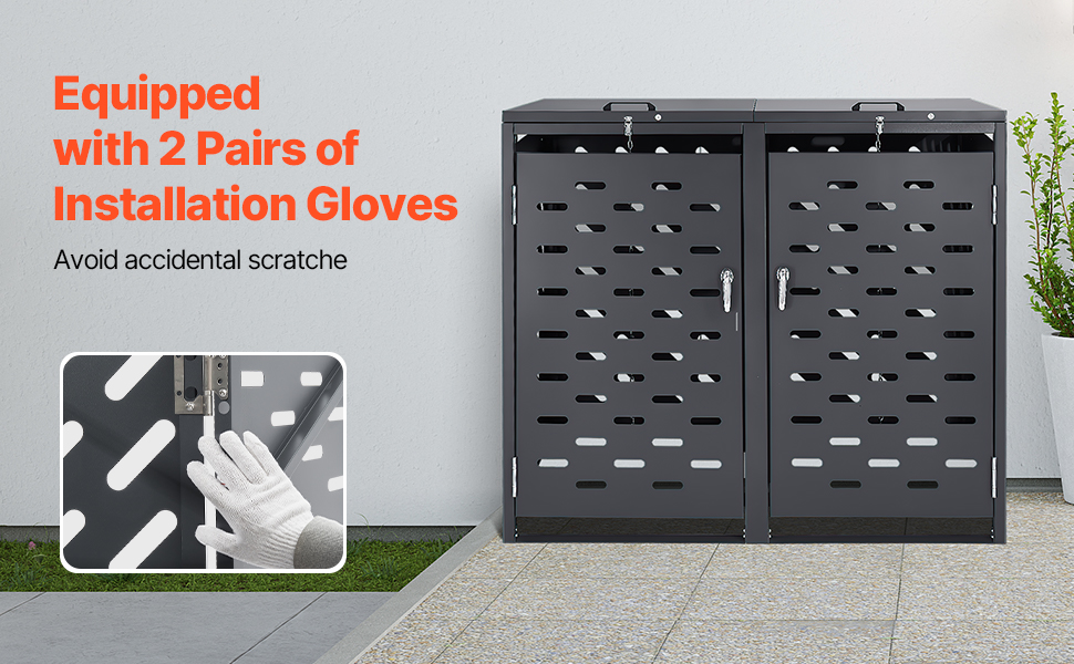 Náš kovový prístrešok na odpadkové koše obsahuje v balení pár montážnych rukavíc, ktoré zabezpečia, že vaše ruky budú počas inštalácie dobre chránené. K dispozícii sú dva páry, ktoré vám a partnerovi uľahčia montáž.