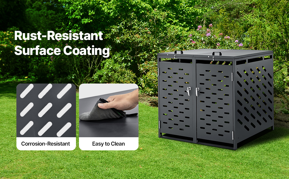 Pozinkovaná oceľ tohto prístrešku na odpadkové koše je ošetrená práškovou farbou, aby sa zabránilo korózii, čo zvyšuje jej odolnosť voči korózii. Táto povrchová úprava tiež uľahčuje čistenie a údržbu, čím sa predlžuje životnosť výrobku.