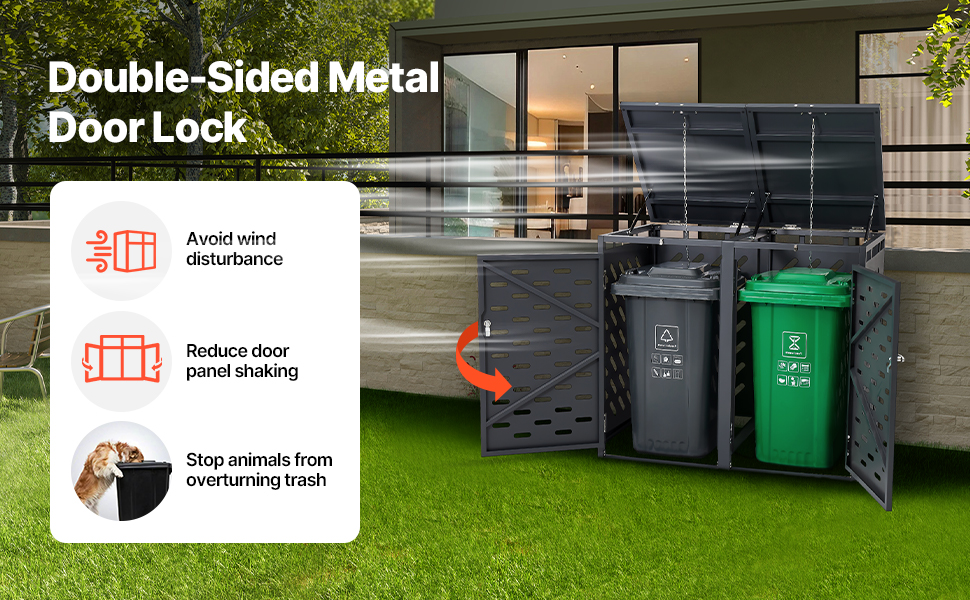 Horná a predná časť prístrešku na odpadky sú vybavené kovovými zámkami, ktoré zabezpečujú, že dvere zostanú bezpečne zatvorené aj vo veternom počasí, čím sa zabráni ich otváraniu alebo hluku. Táto konštrukcia predlžuje životnosť dverí a zabraňuje prístupu zvierat k odpadkovému košu.