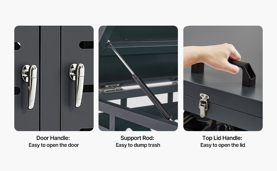 Tento sklad na odpadky obsahuje niekoľko praktických konštrukčných prvkov, ako je rukoväť predných dverí, rukoväť horného veka a podporná tyč veka, ktoré zlepšujú jednoduchosť a pohodlie pri používaní.