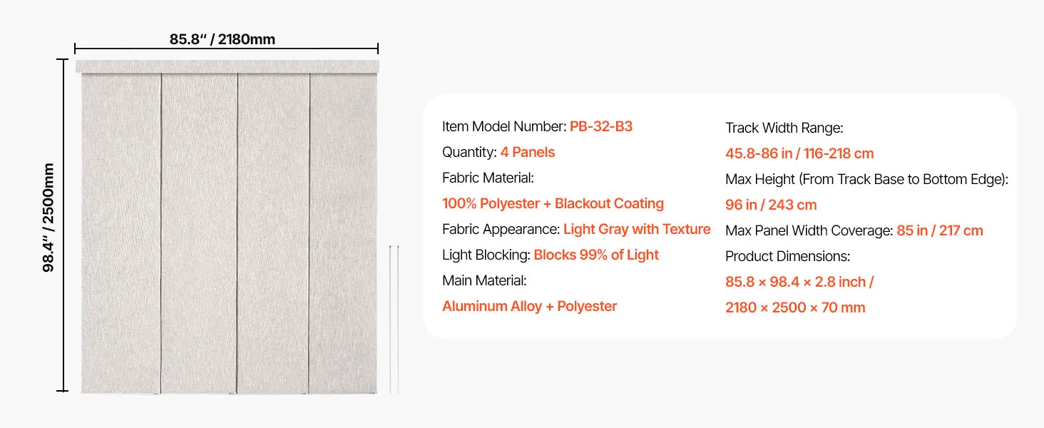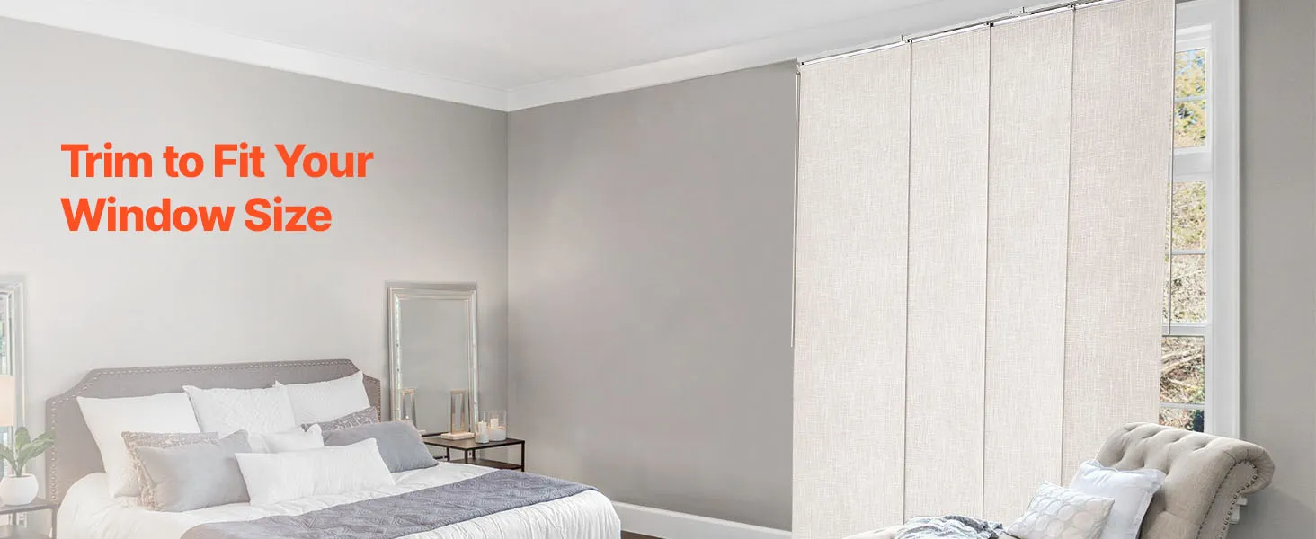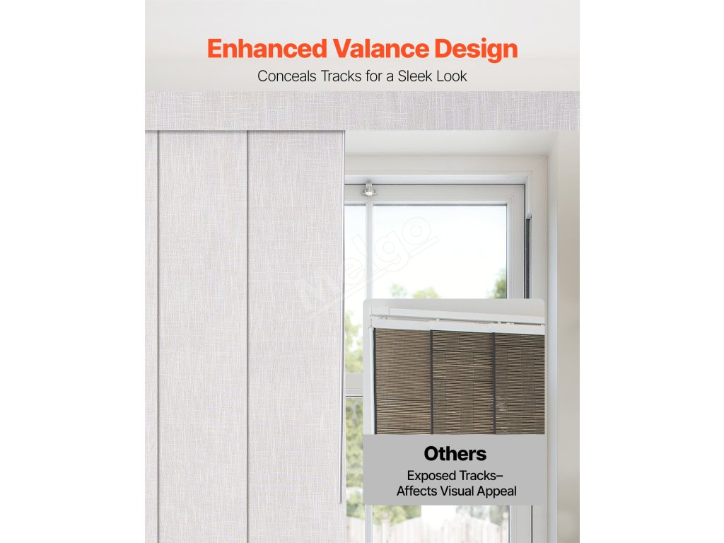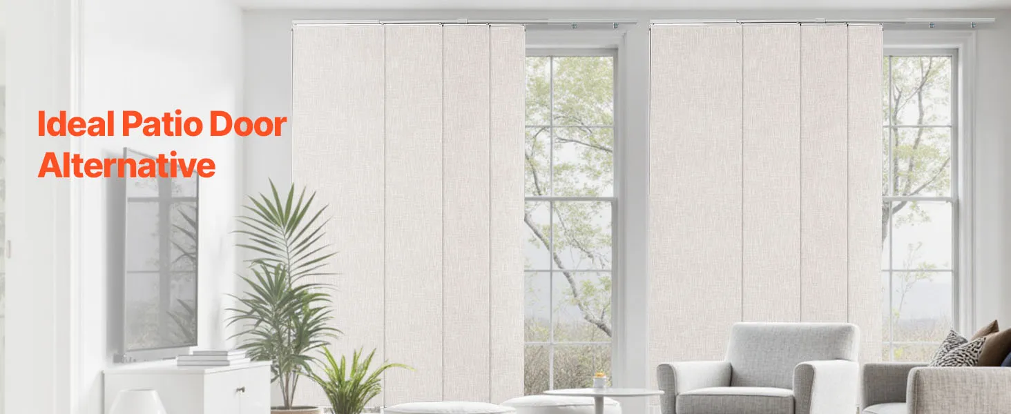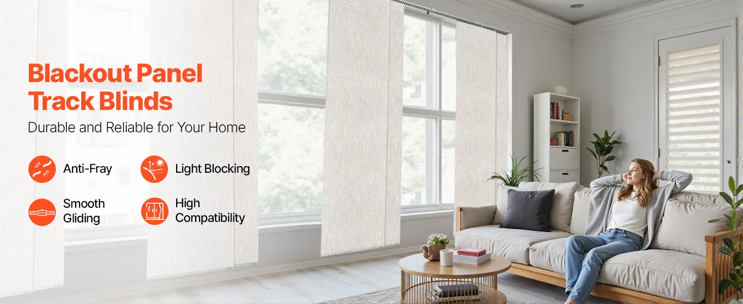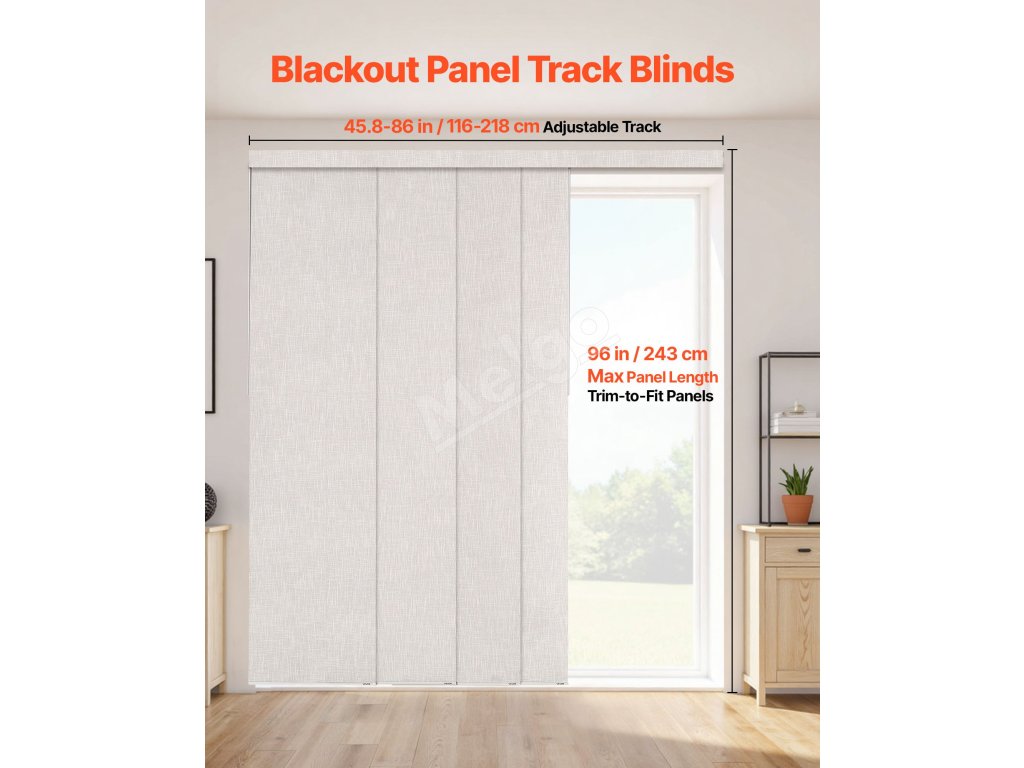 Tieto panelové žalúzie vyrobené z odolnej polyesterovej tkaniny so zatemňujúcou vrstvou blokujú 99 % svetla a zabezpečujú súkromie. Vrchný volán elegantne zakrýva dráhu a vytvára elegantný vzhľad. Sú ideálne pre terasové dvere, veľké okná od podlahy až po strop a ďalšie, pretože zaručujú štýl aj funkčnosť.