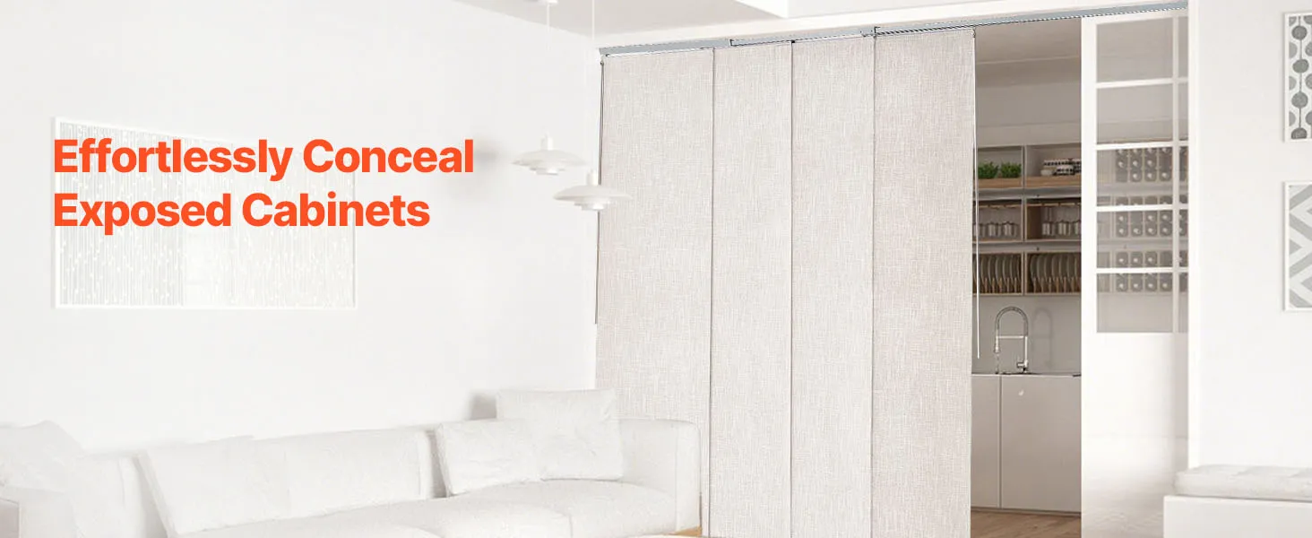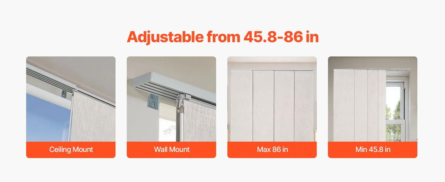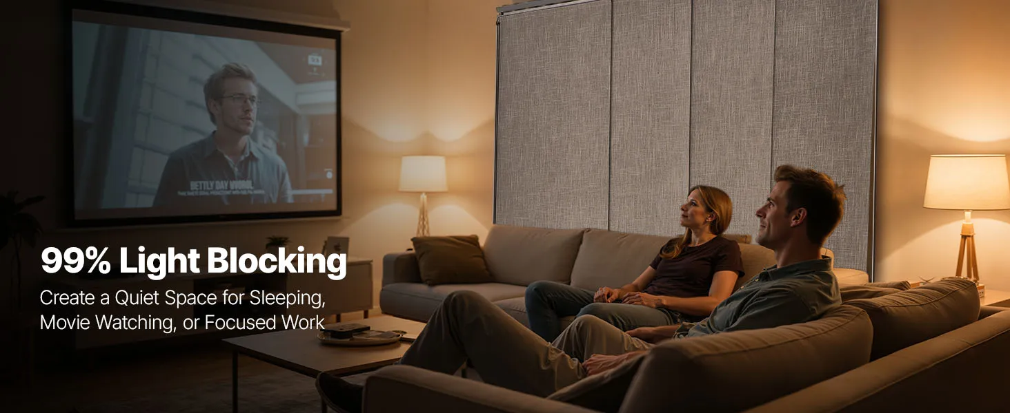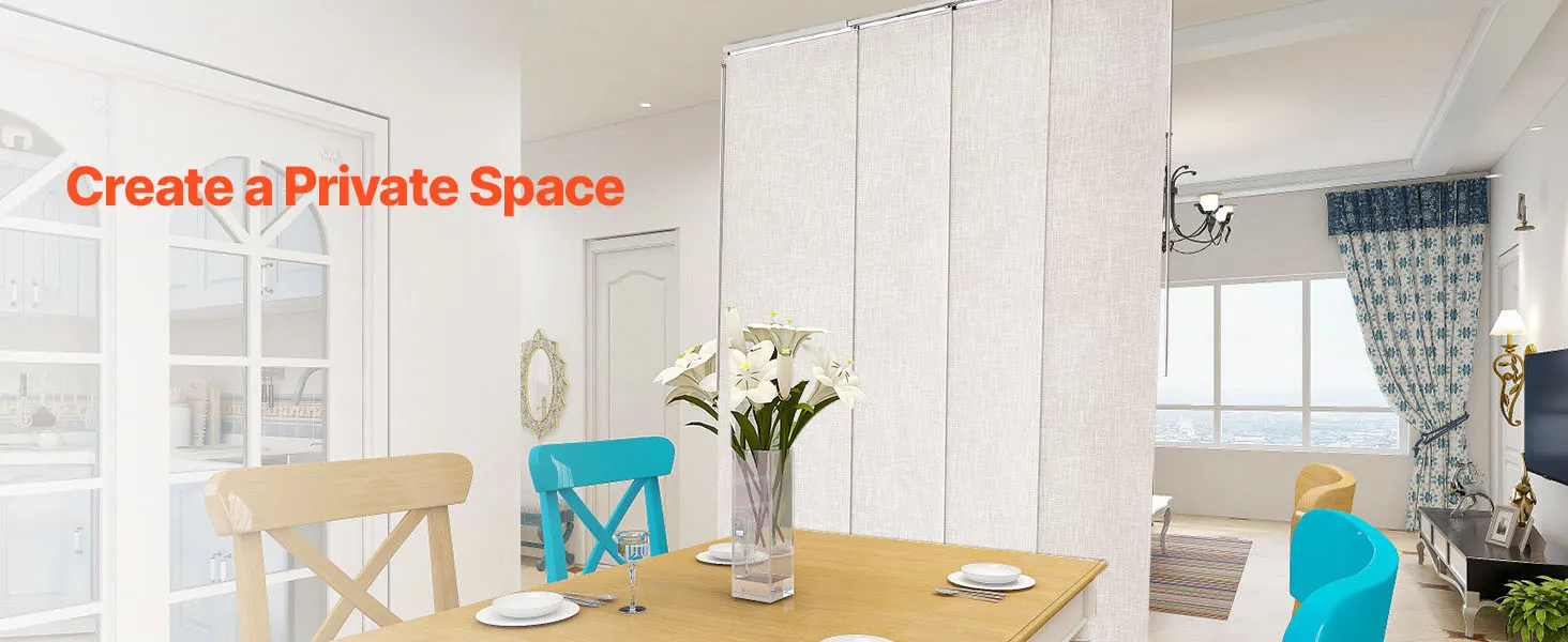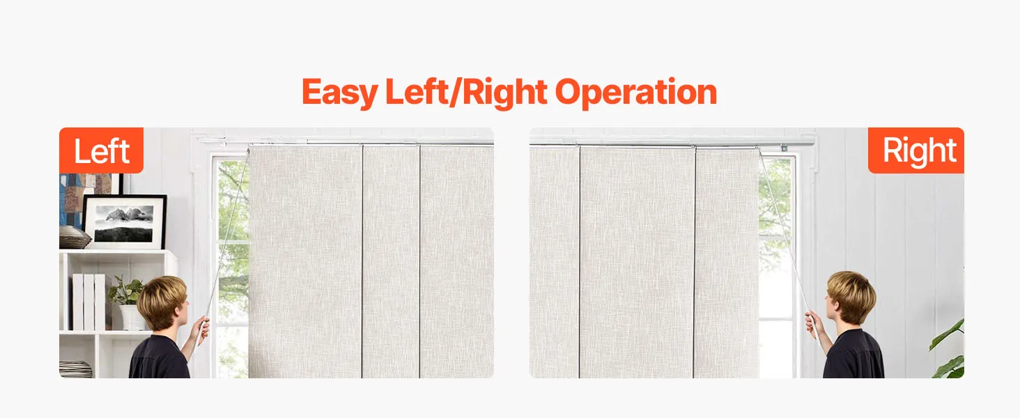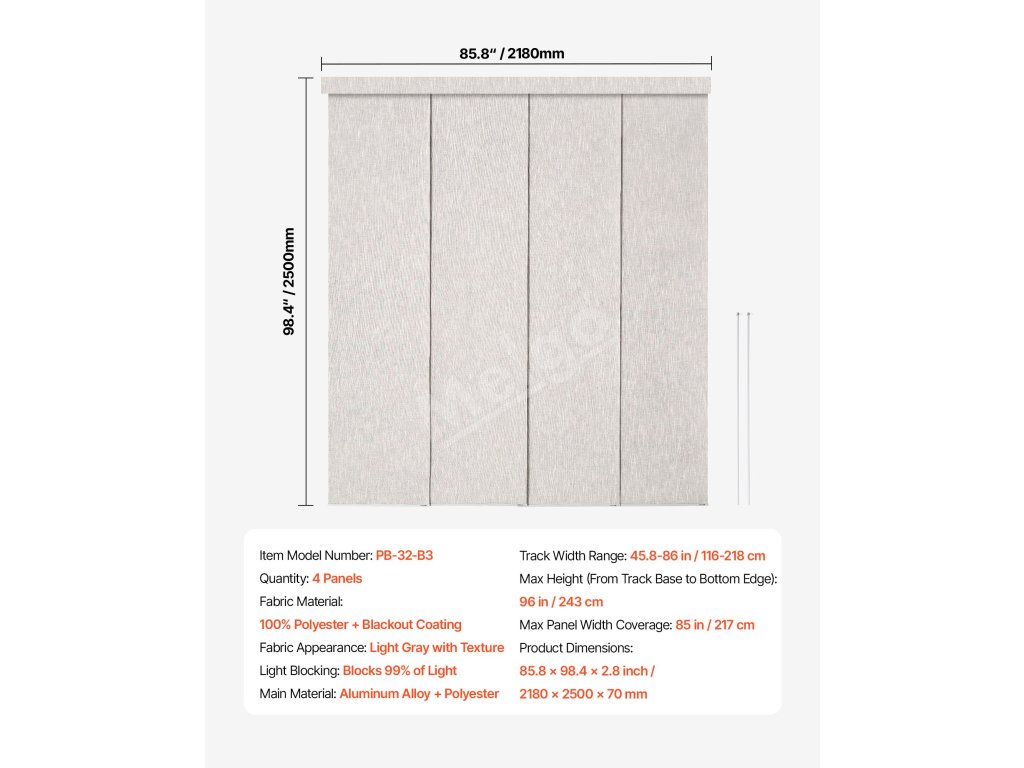Tieto panelové žalúzie vyrobené z odolnej polyesterovej tkaniny so zatemňujúcou vrstvou blokujú 99 % svetla a zabezpečujú súkromie. Vrchný volán elegantne zakrýva dráhu a vytvára elegantný vzhľad. Sú ideálne pre terasové dvere, veľké okná od podlahy až po strop a ďalšie, pretože zaručujú štýl aj funkčnosť.