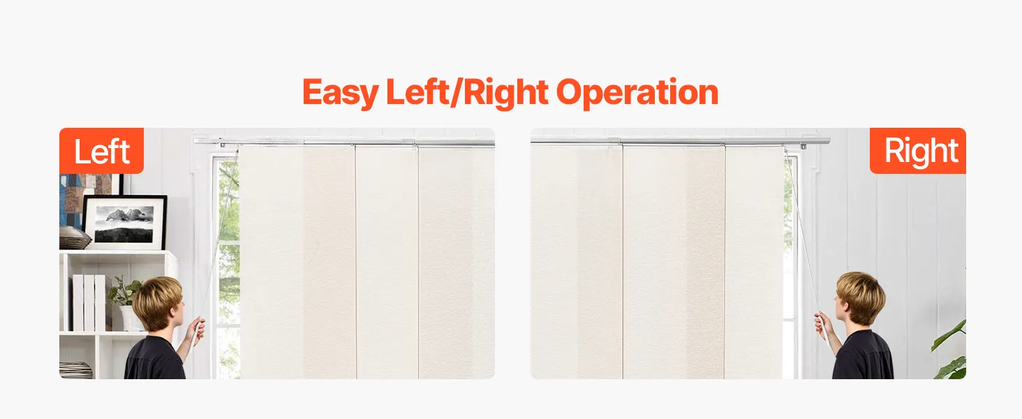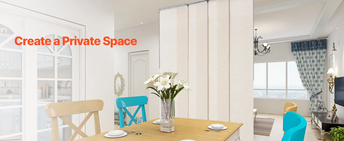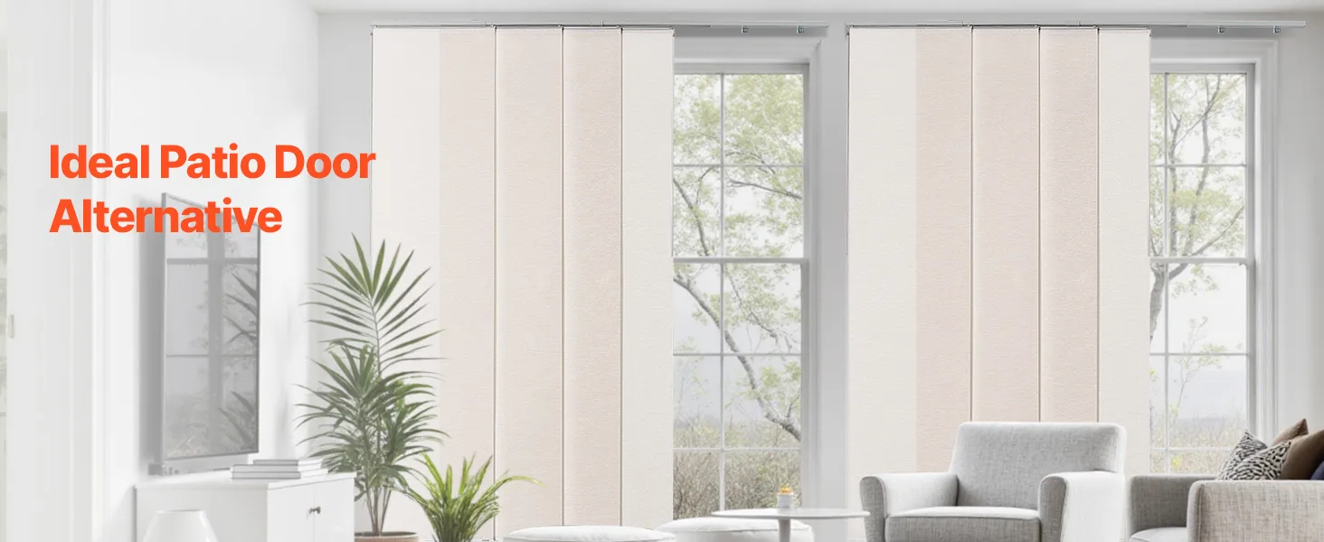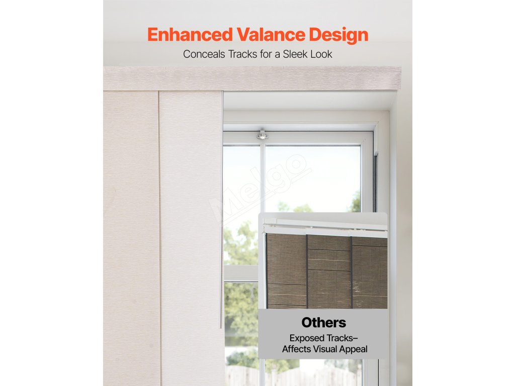 Tieto panelové žalúzie vyrobené z odolnej polyesterovej tkaniny sú odolné voči roztrhnutiu a sú konštruované tak, aby vydržali. Vrchný volán elegantne zakrýva dráhu a vytvára elegantný vzhľad. Vďaka jednoduchému posúvaniu vľavo alebo vpravo sú ideálne pre terasové dvere, okná od podlahy až po strop a ďalšie zariadenia, ktoré zaručujú štýl a funkčnosť.