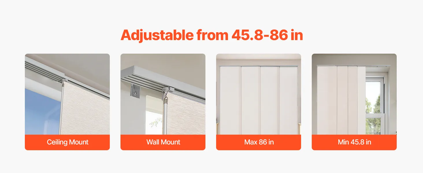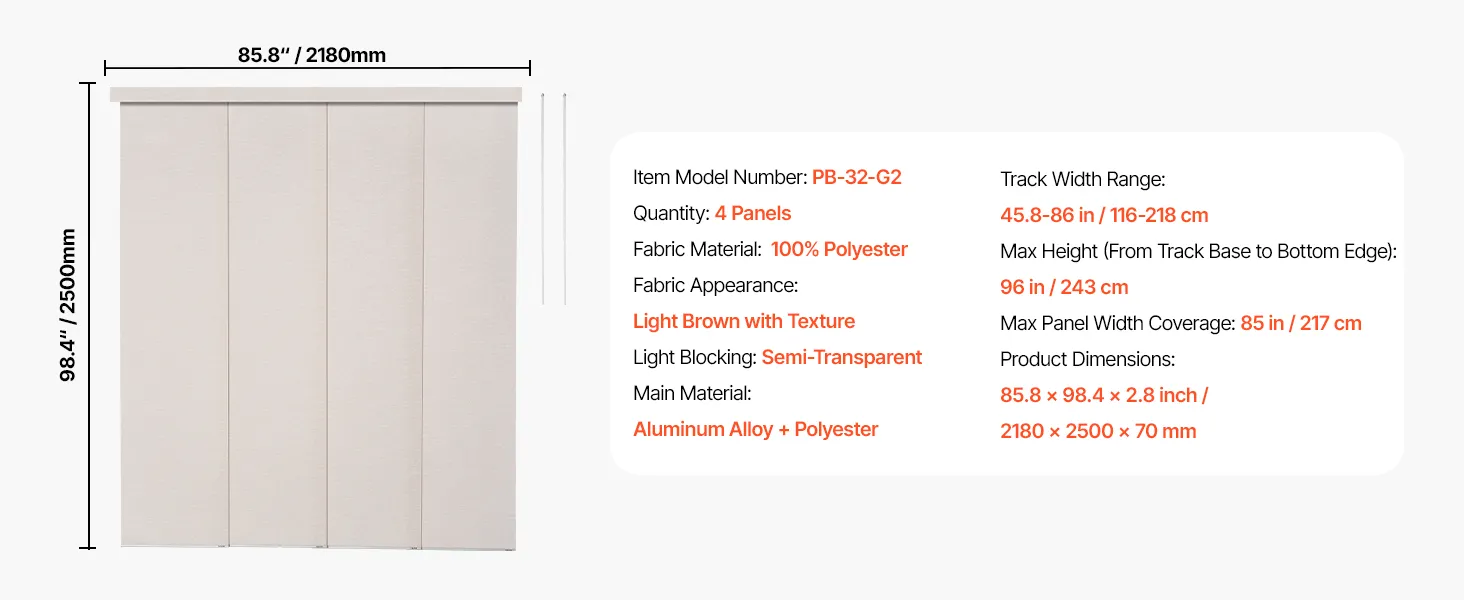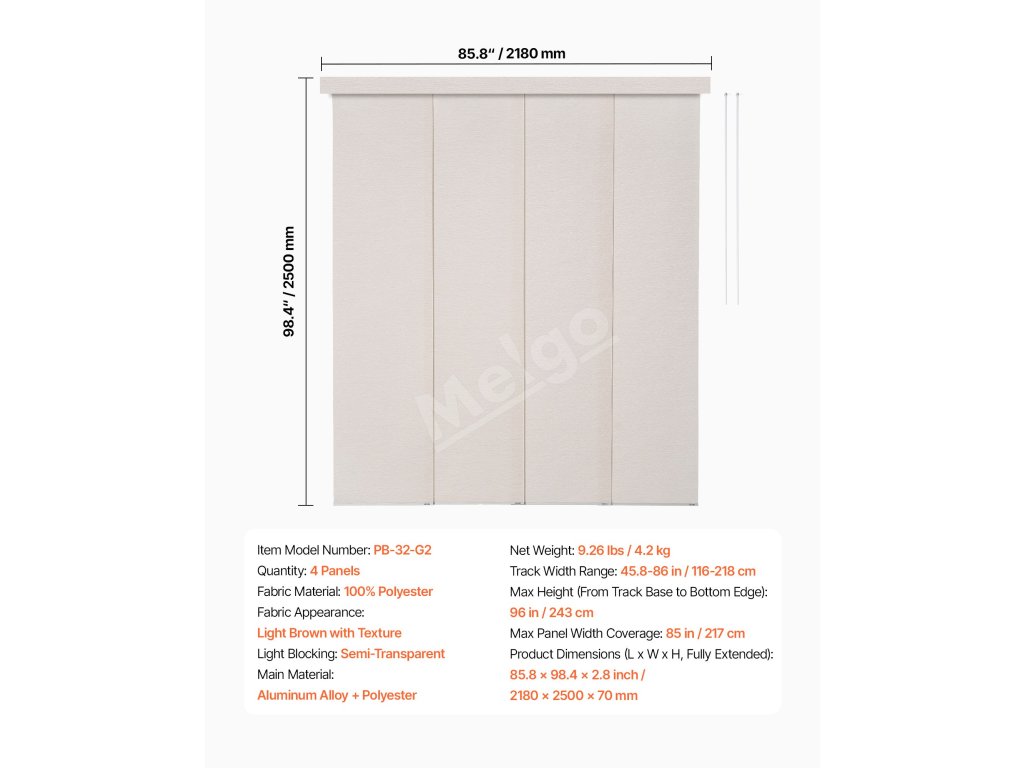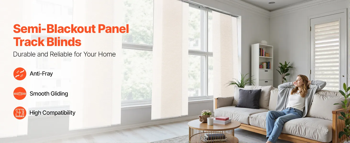 Tieto panelové žalúzie vyrobené z odolnej polyesterovej tkaniny sú odolné voči roztrhnutiu a sú konštruované tak, aby vydržali. Vrchný volán elegantne zakrýva dráhu a vytvára elegantný vzhľad. Vďaka jednoduchému posúvaniu vľavo alebo vpravo sú ideálne pre terasové dvere, okná od podlahy až po strop a ďalšie zariadenia, ktoré zaručujú štýl a funkčnosť.