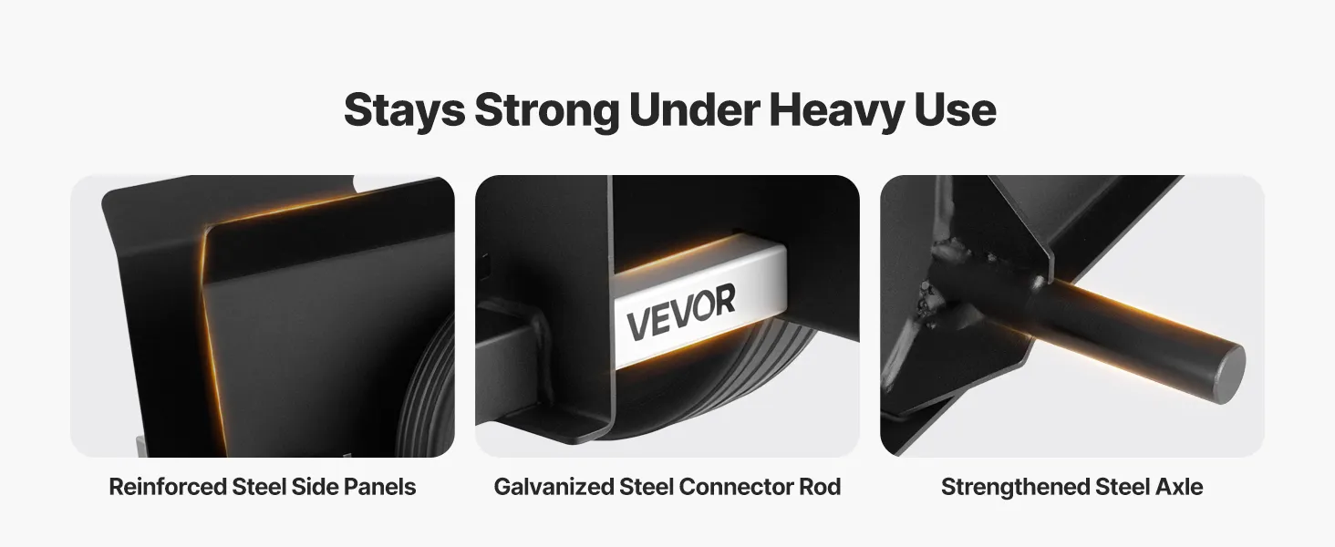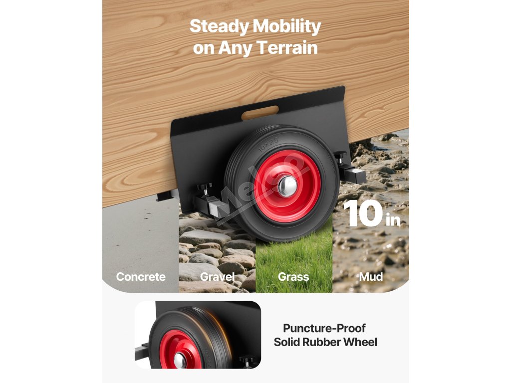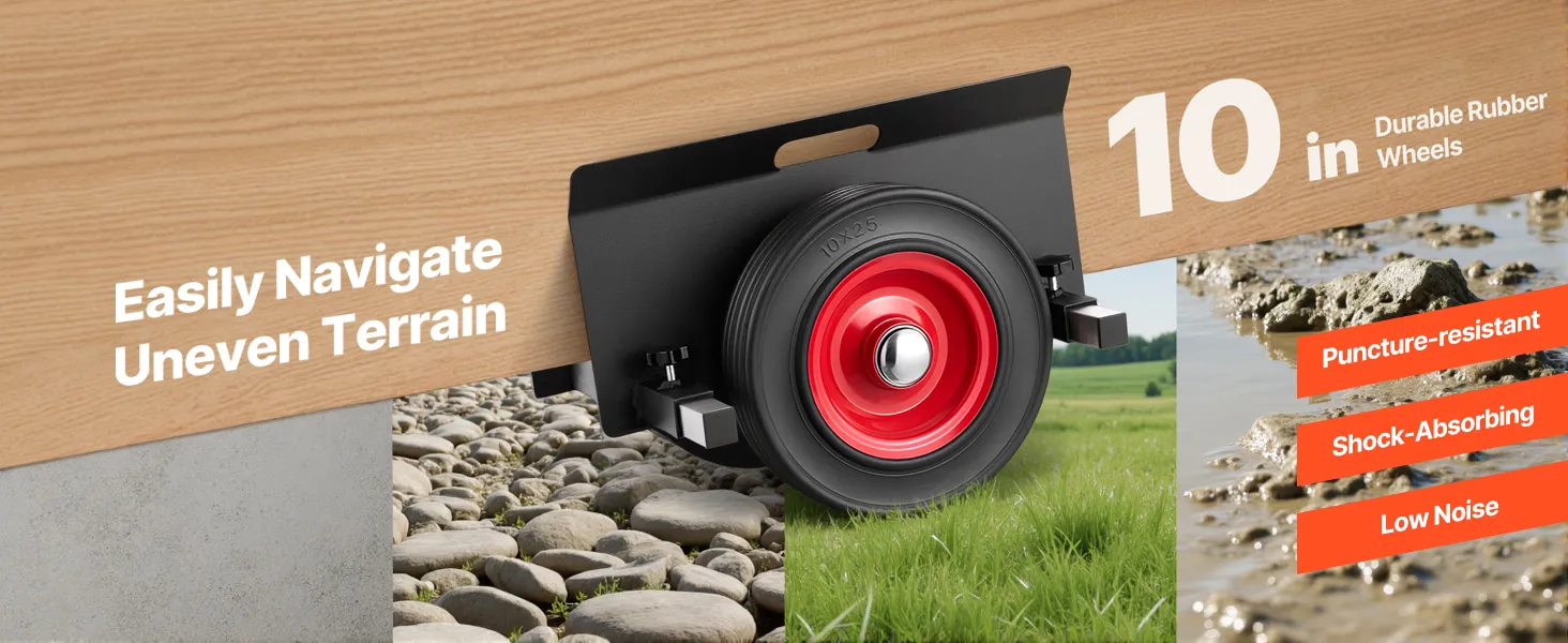 Vybavený 2 pevnými gumovými kolesami, ktoré účinne absorbujú nárazy a odolávajú prepichnutiu klincami alebo nečistotami, čím zabezpečujú dlhú životnosť.