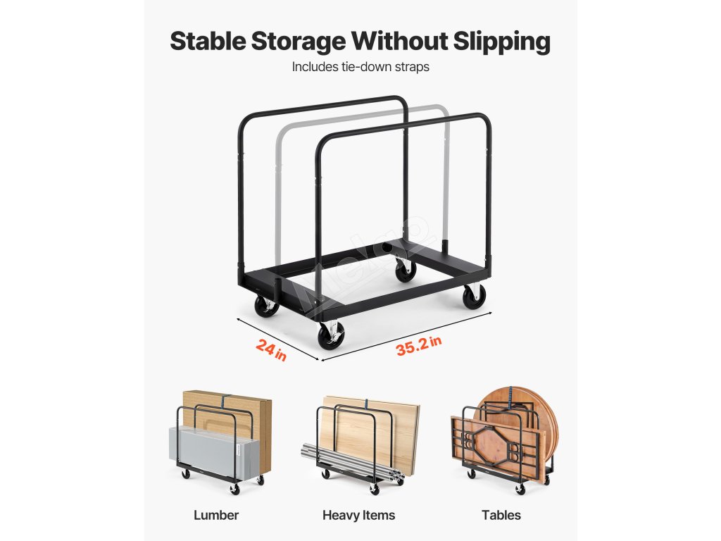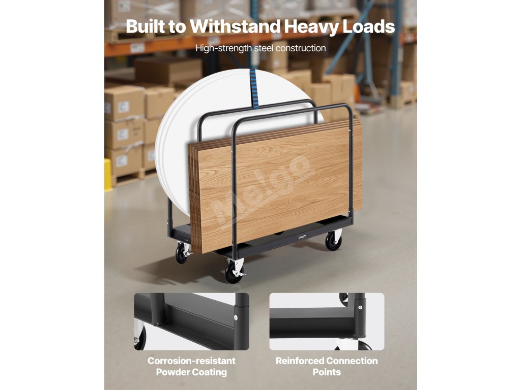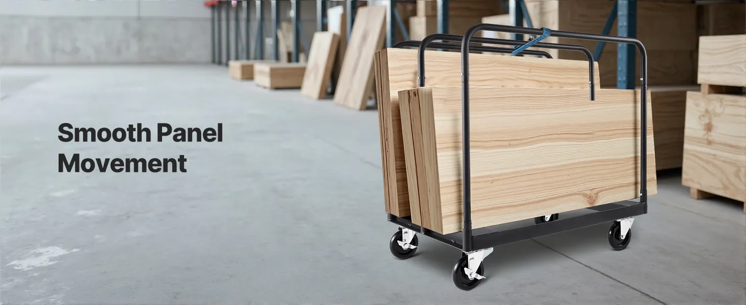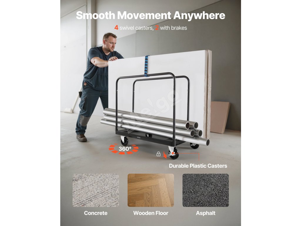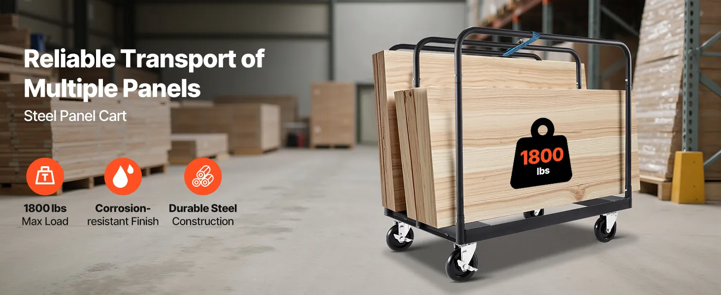 Tento ťažký oceľový vozík na panely unesie až 1800 kg. Umožňuje jednoduchý presun viacerých panelov, čím šetrí prácu, zvyšuje efektivitu a zabezpečuje bezpečnú prepravu.