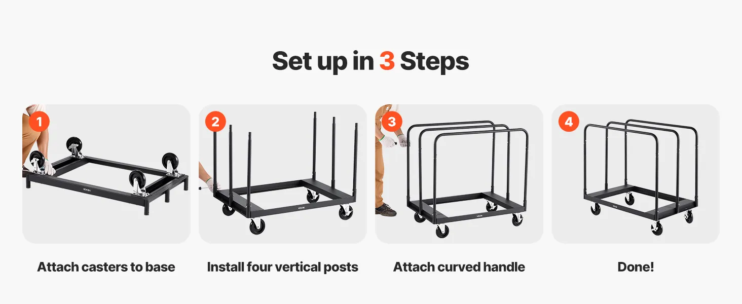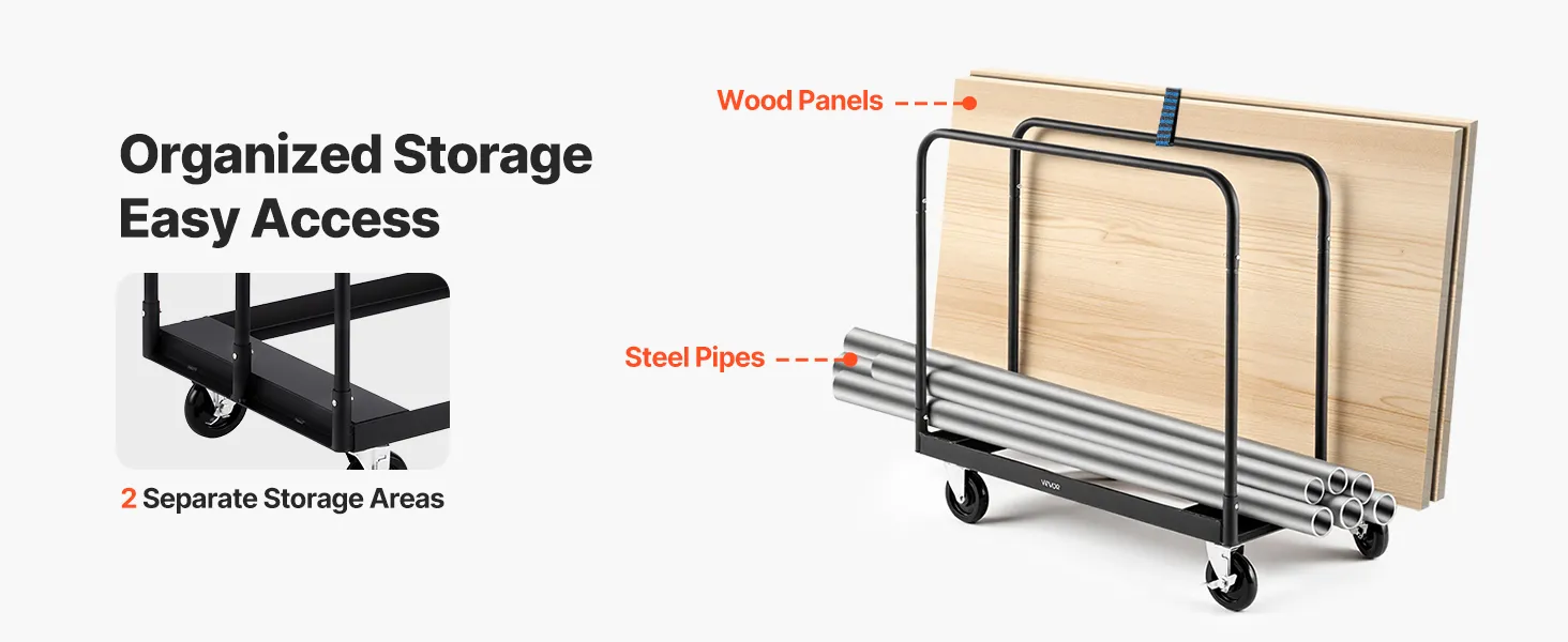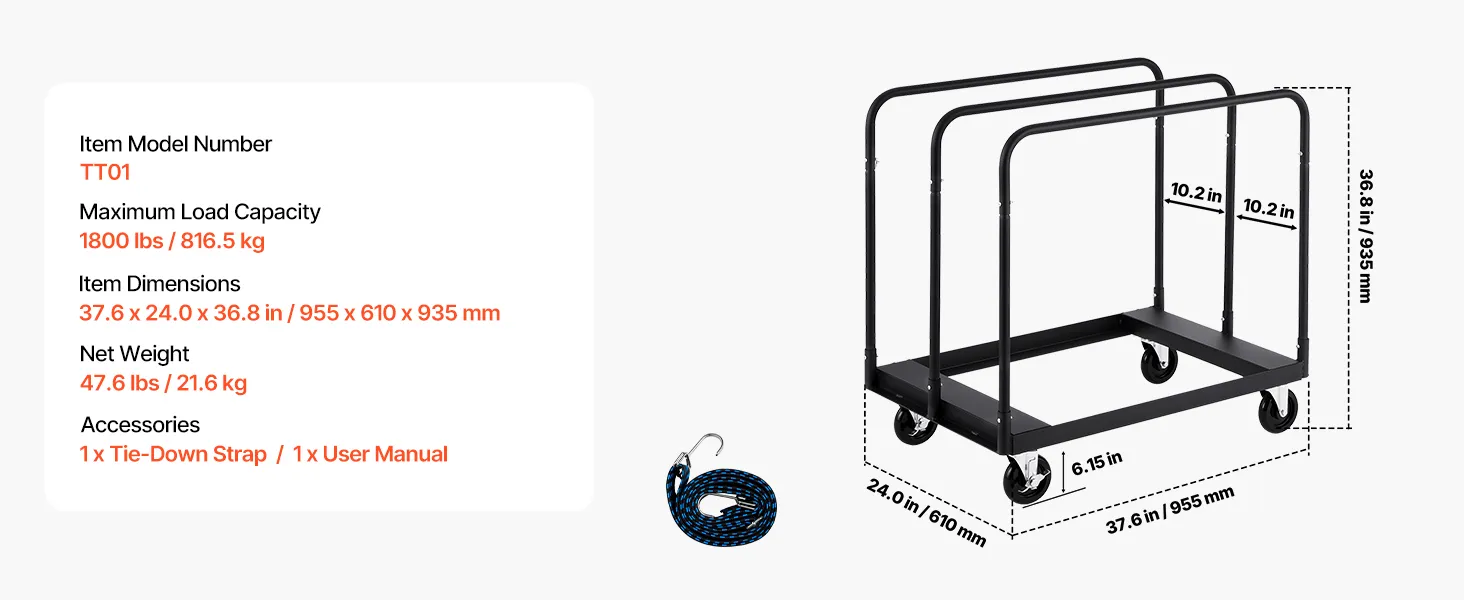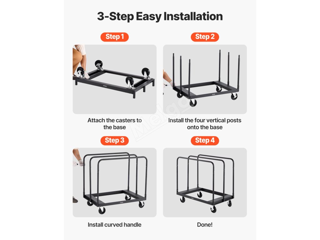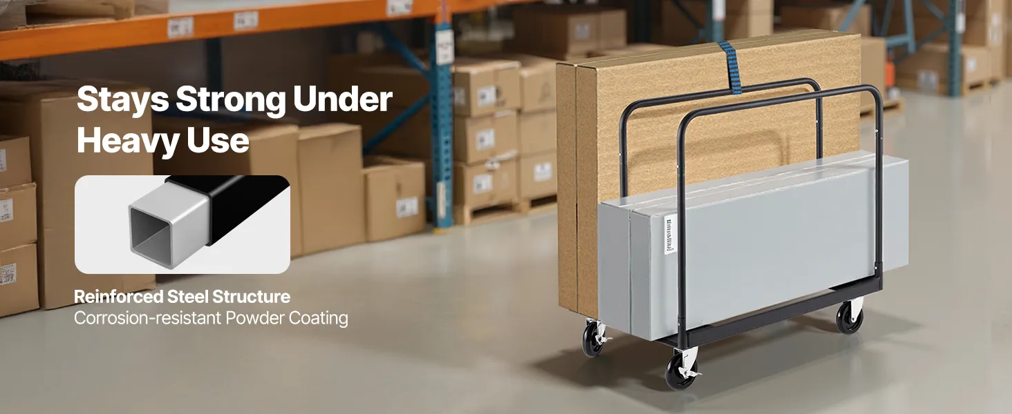 Tento ťažký oceľový vozík na panely unesie až 1800 kg. Umožňuje jednoduchý presun viacerých panelov, čím šetrí prácu, zvyšuje efektivitu a zabezpečuje bezpečnú prepravu.