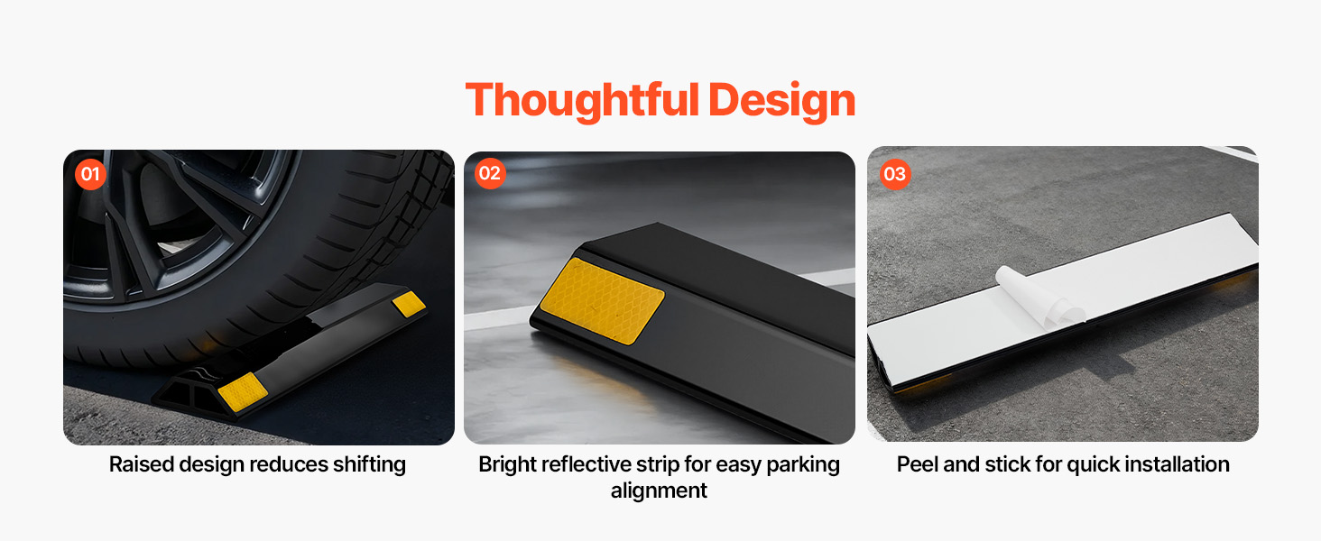 Náš parkovací blok má vyvýšenú konštrukciu, ktorá znižuje posun. Jasné reflexné pásy uľahčujú identifikáciu parkovacieho miesta. Na rýchlu inštaláciu stačí odlepiť a nalepiť.